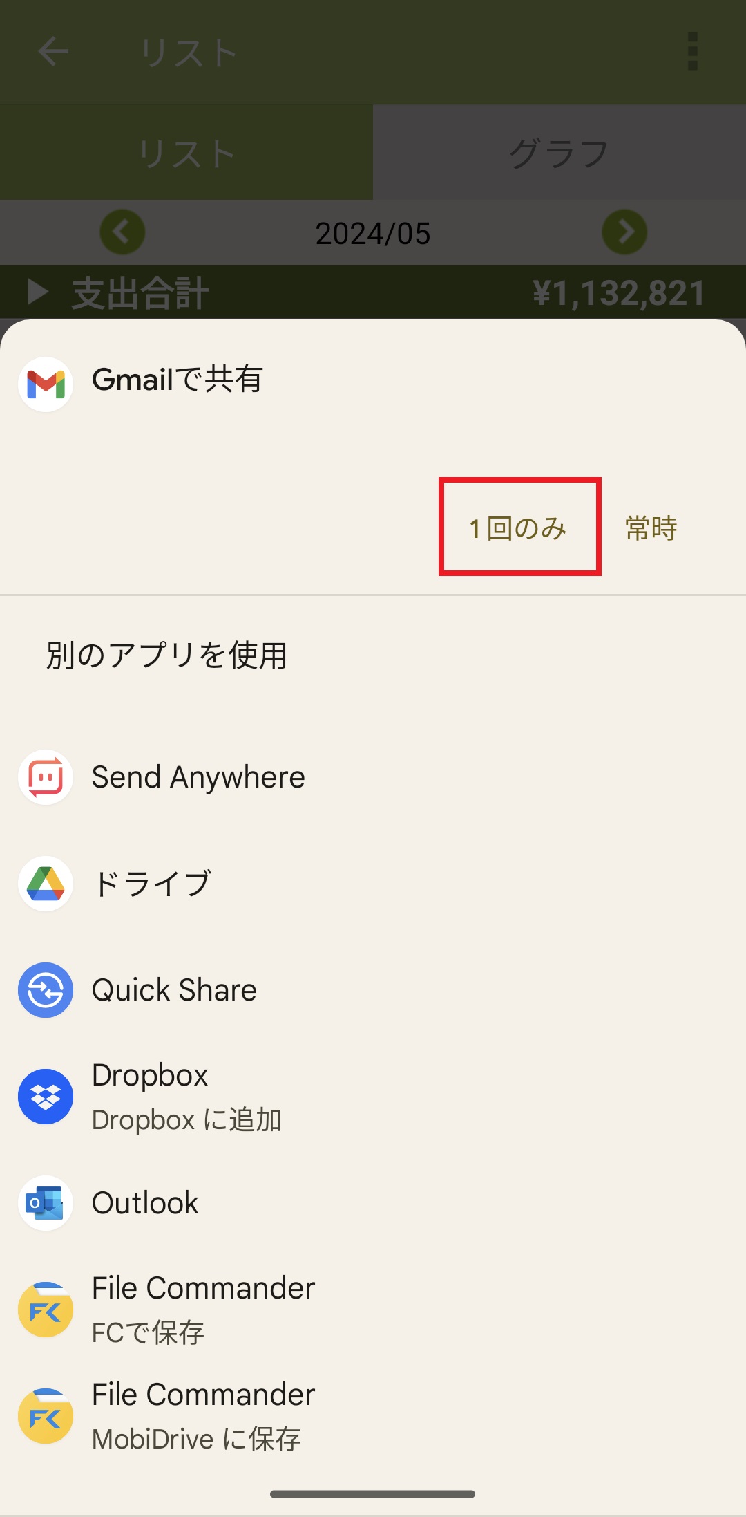 8.Gmailアプリを選択し、『1回のみ』を押してください。