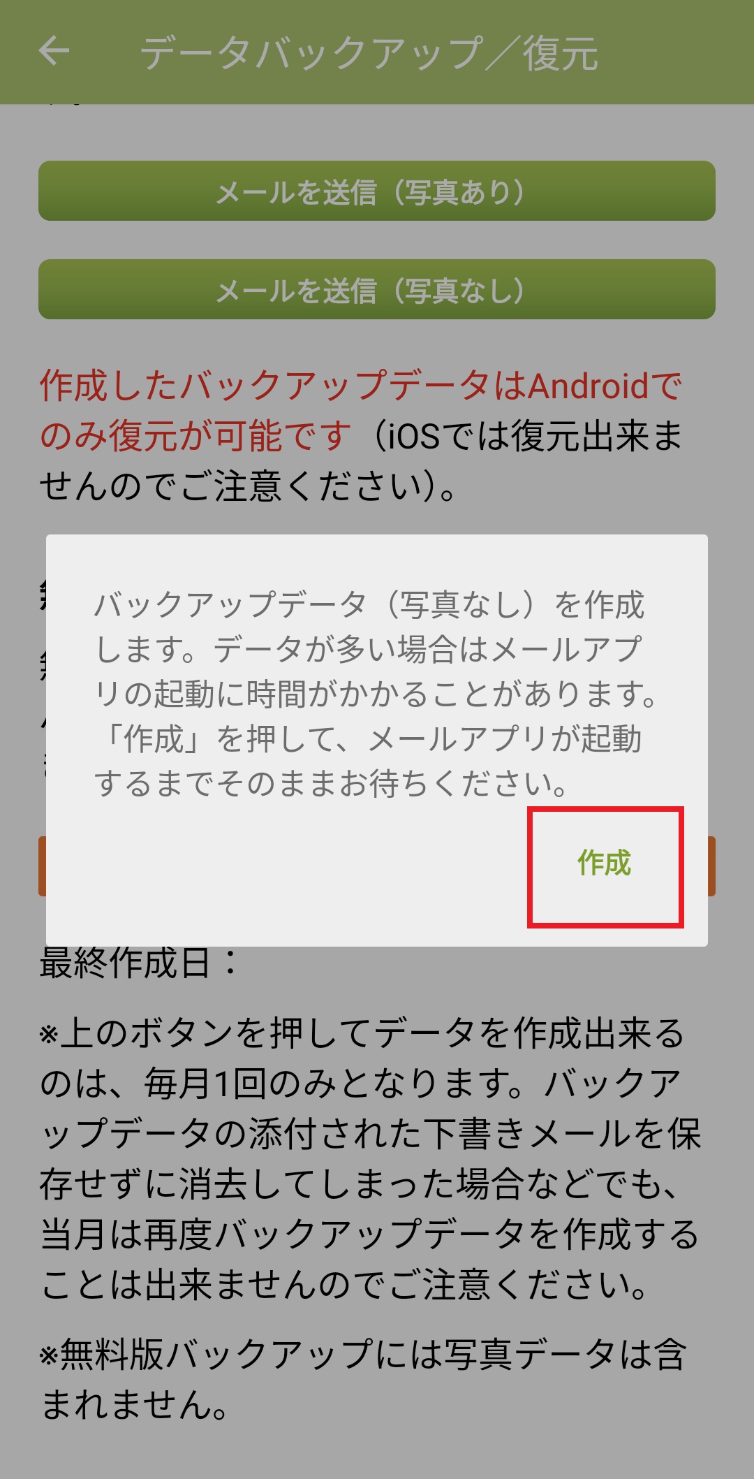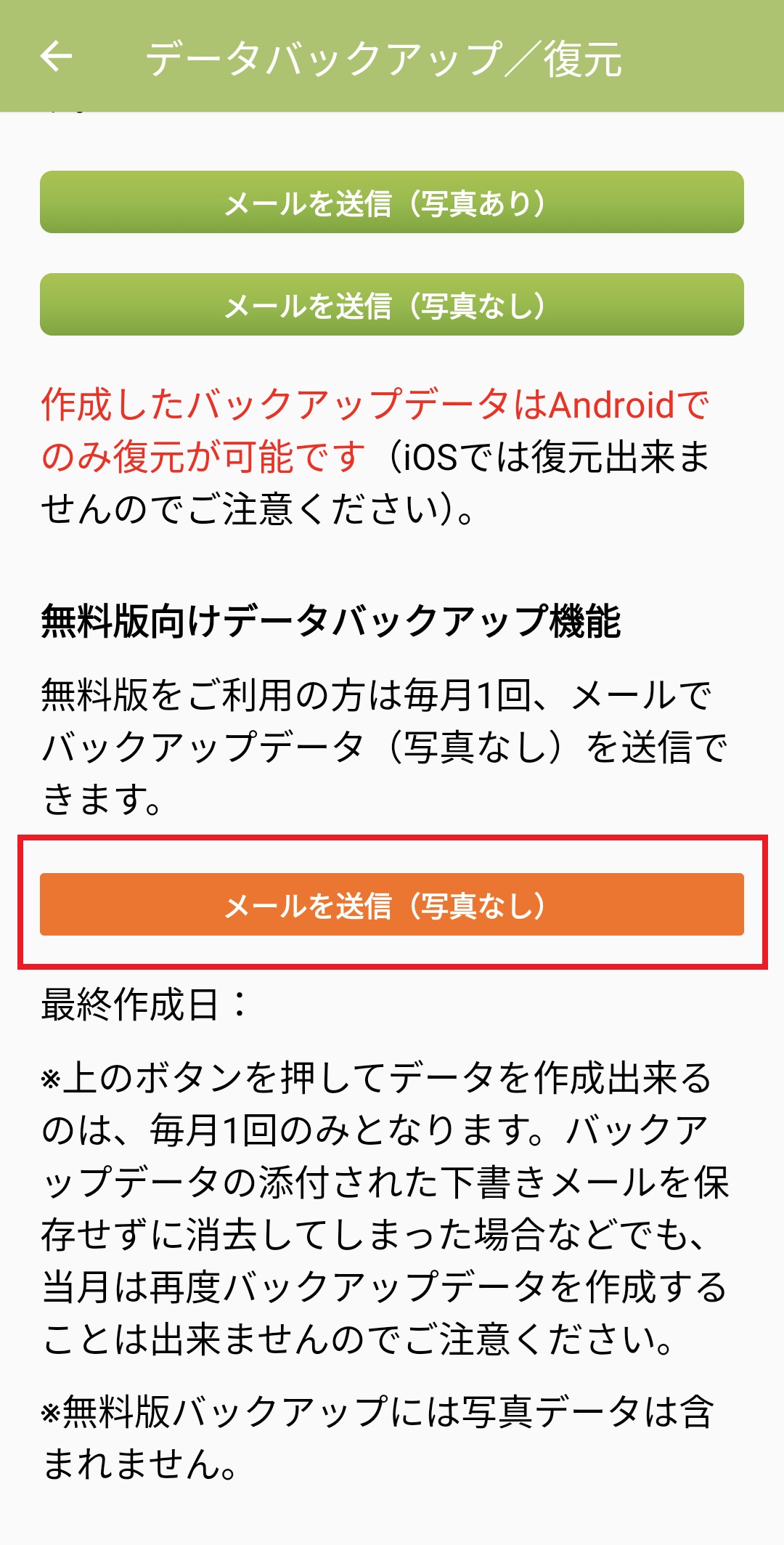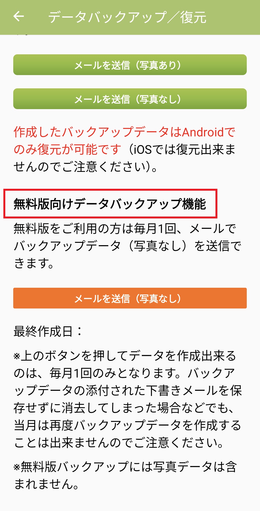 ・無料版向けのバックアップは月に1回までご利用可能です。1ヶ月後に新しいバックアップが保存できるようになります。