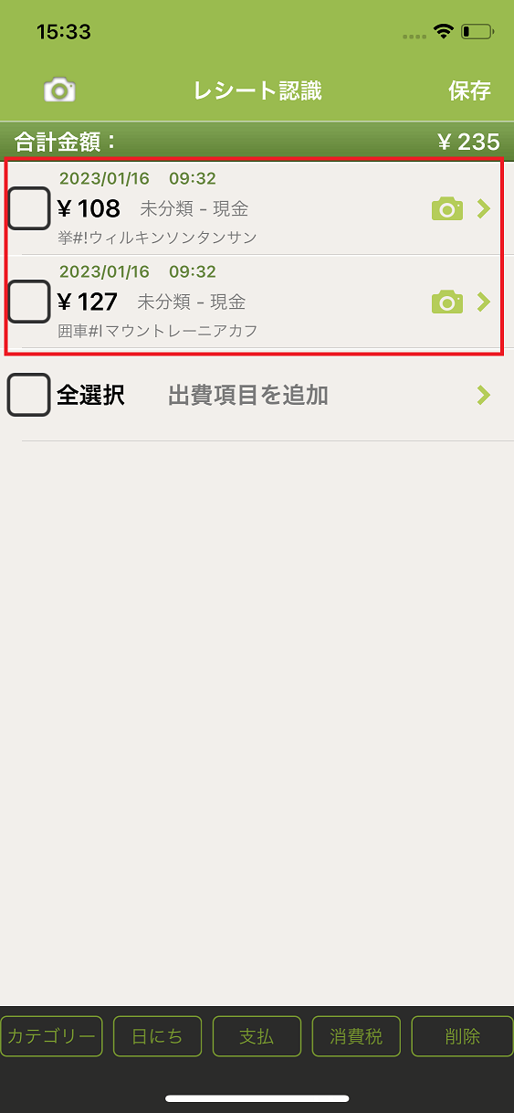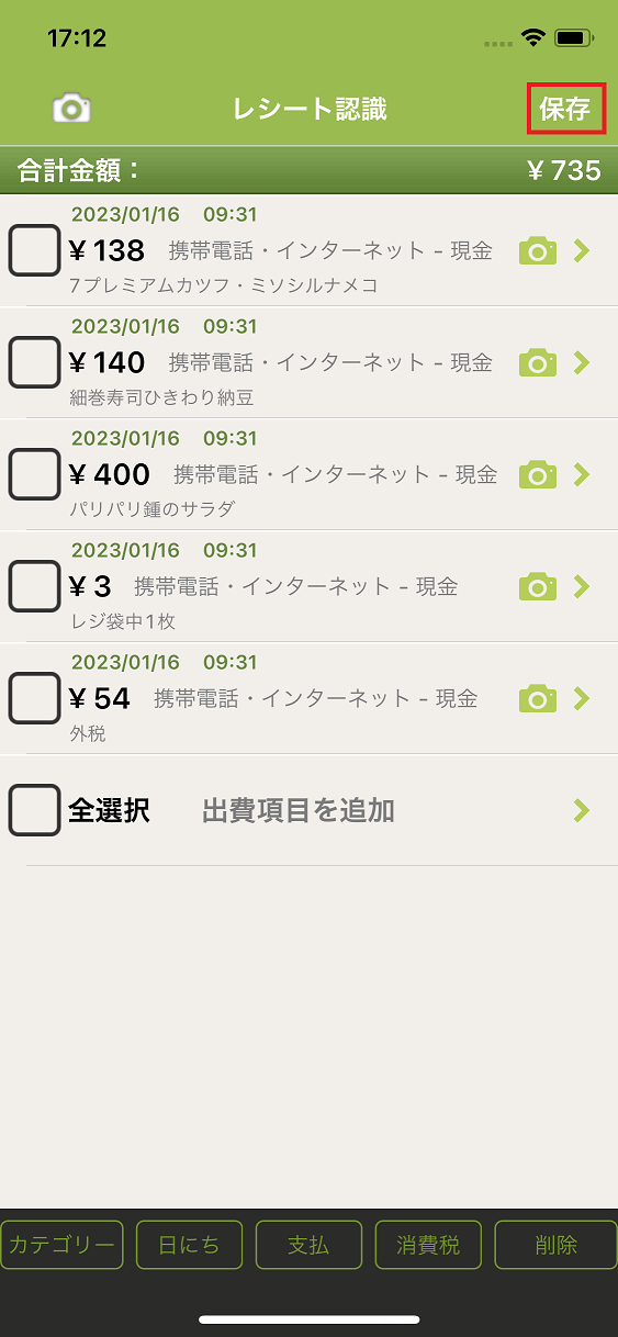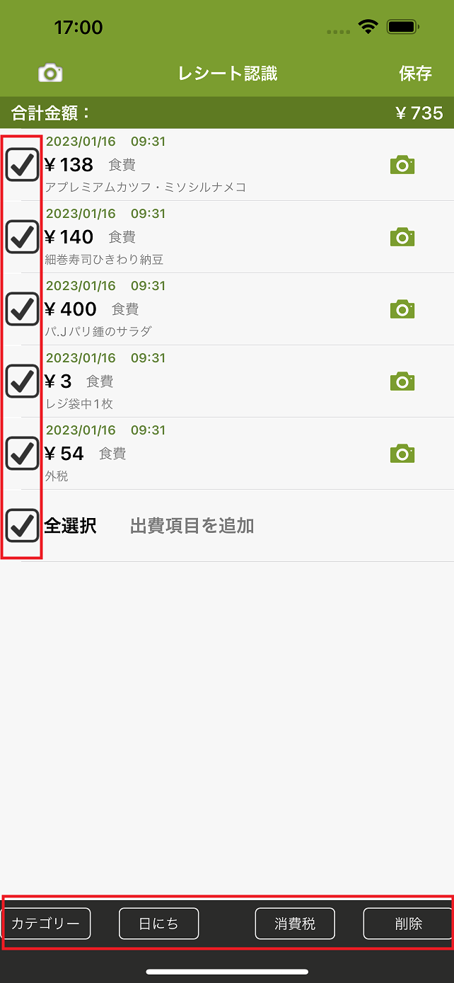 8.カテゴリー・日付・消費税・支払方法を設定する場合は、左側のチェックボックスをタップまたは「全選択」を押して、チェックマークをつけ、画面下部のメニュー(カテゴリー、日にち、消費税、削除)ボタンで一括変更も可能です。