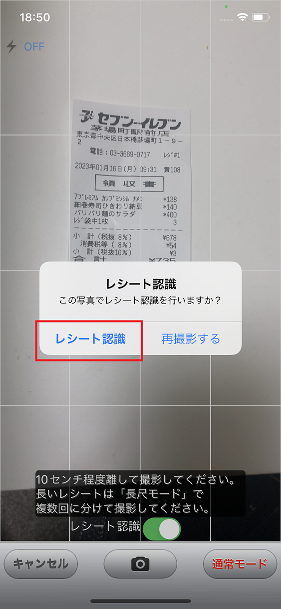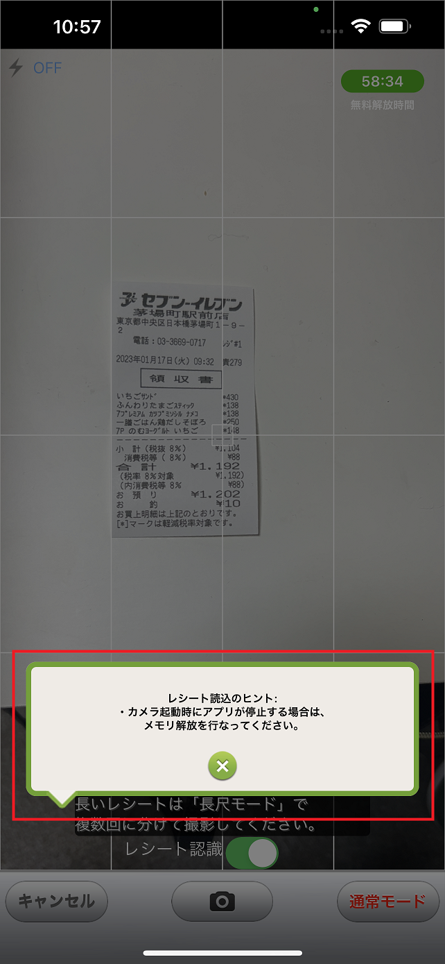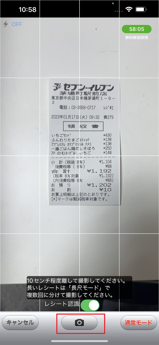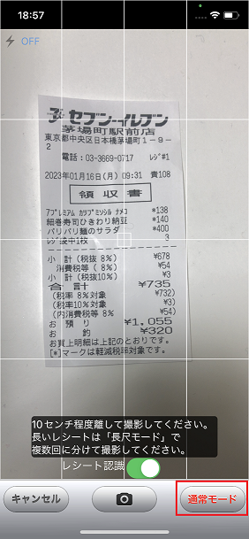 レシートの上下が収まりきらない場合はカメラ画面右下の「通常モード」ボタンを押していただくと「長尺モード」に切り替えて撮影していただくことも可能です。