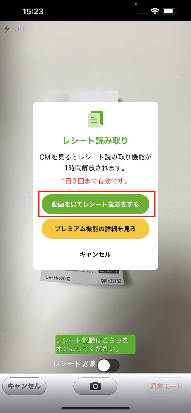 レシート認識機能は有料機能となりますが、動画広告をご覧いただくとレシート認識機能が1時間解放されます。