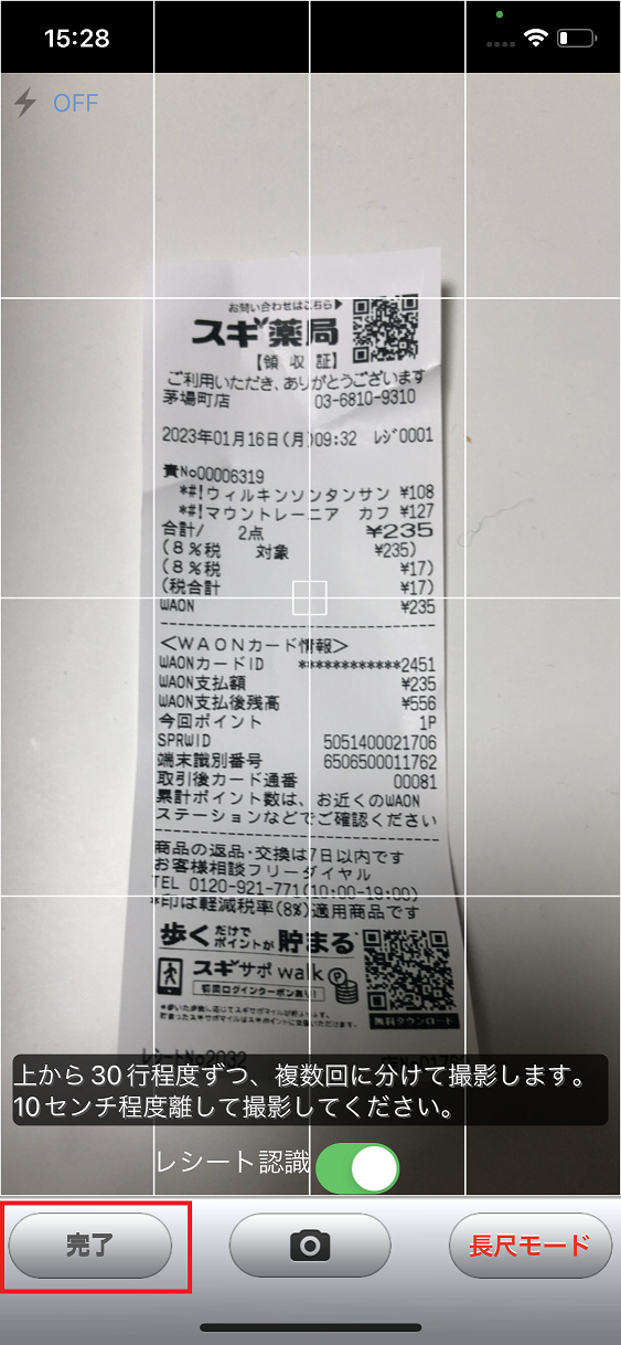 長尺モードでは写真を複数回にわけてレシートを撮影し(下部中央のカメラボタンを押し)、上から下まで撮影したらカメラボタン左横の「完了」ボタンを押してレシート認識へ進んでください。