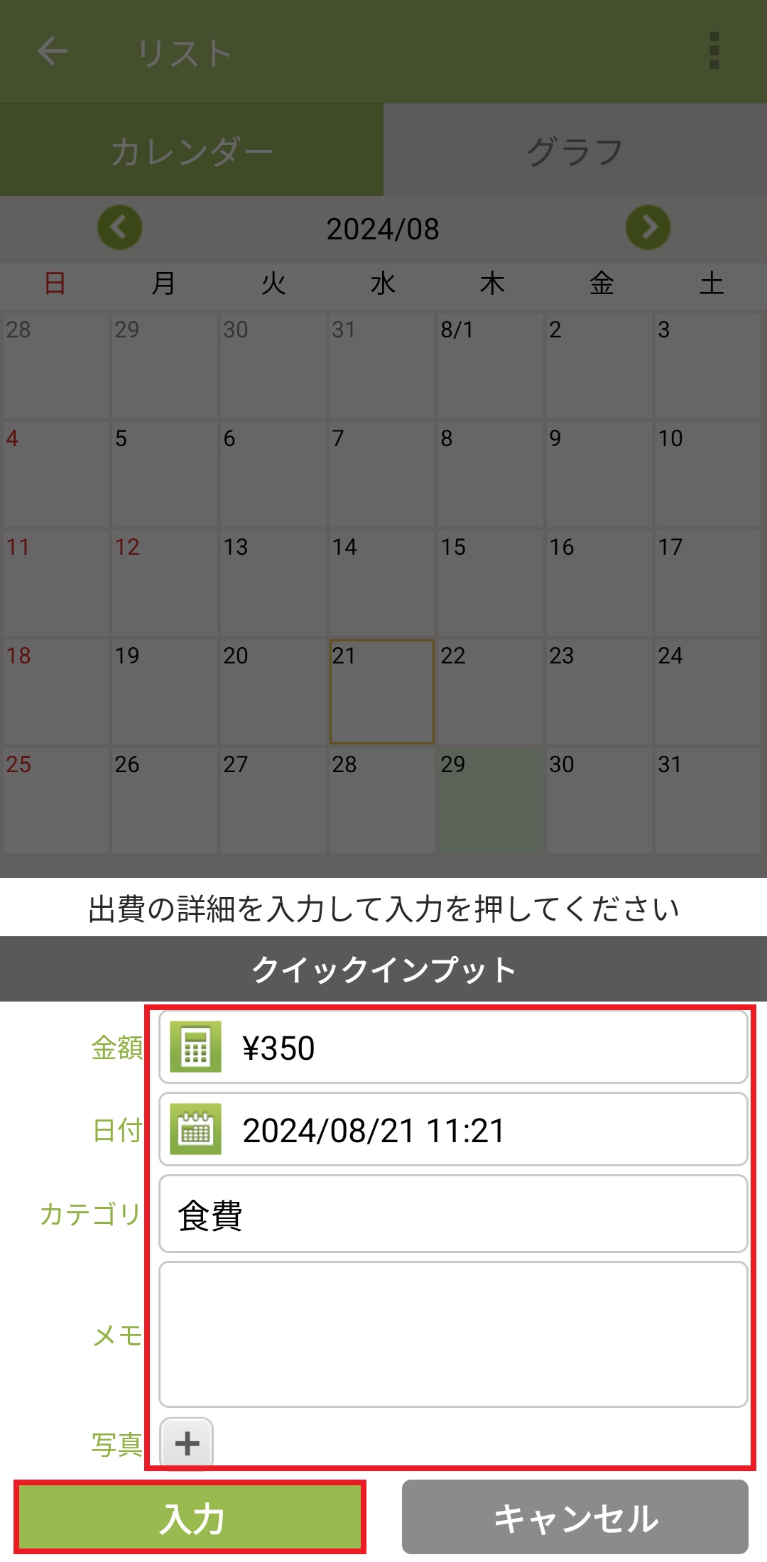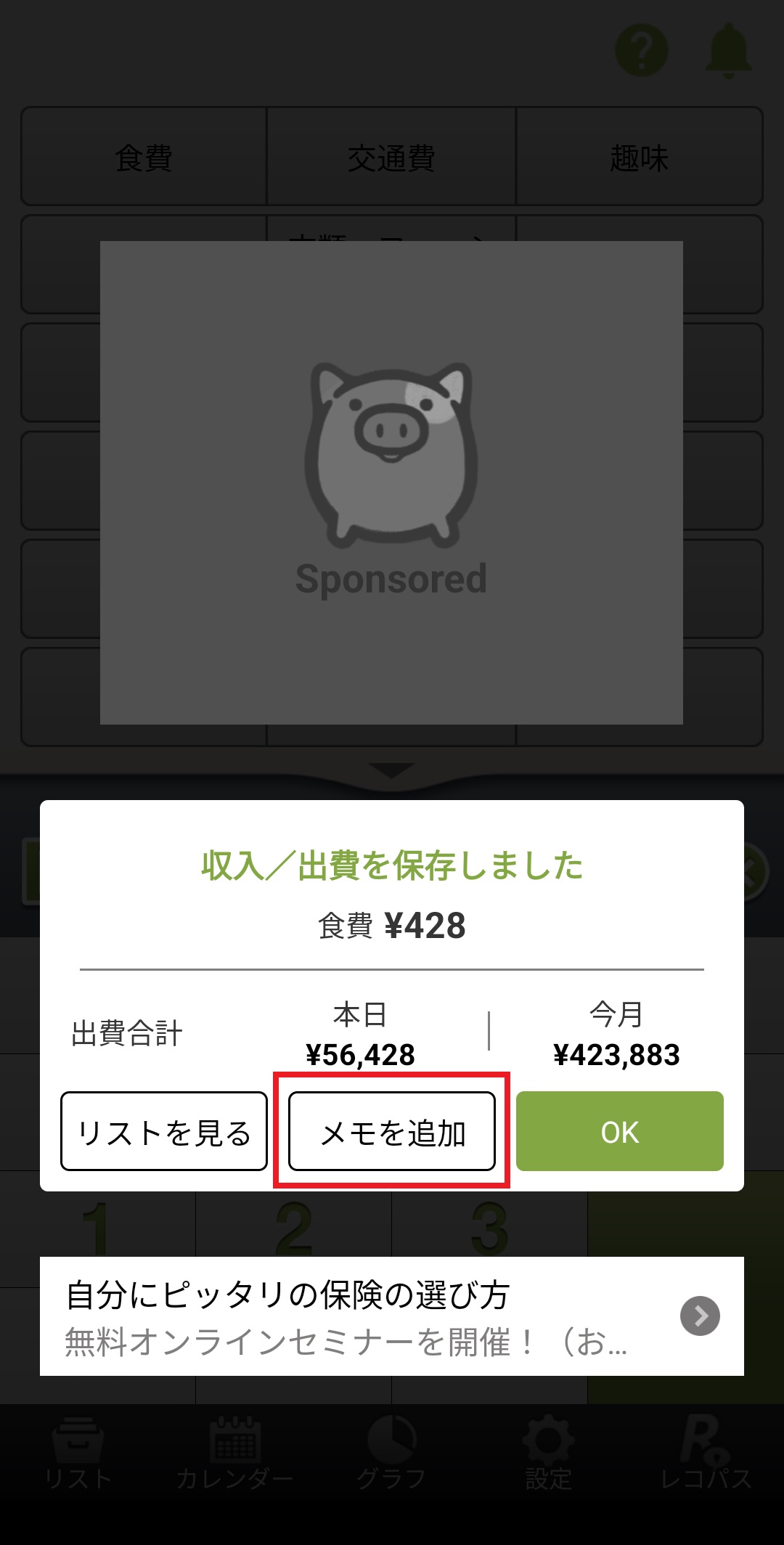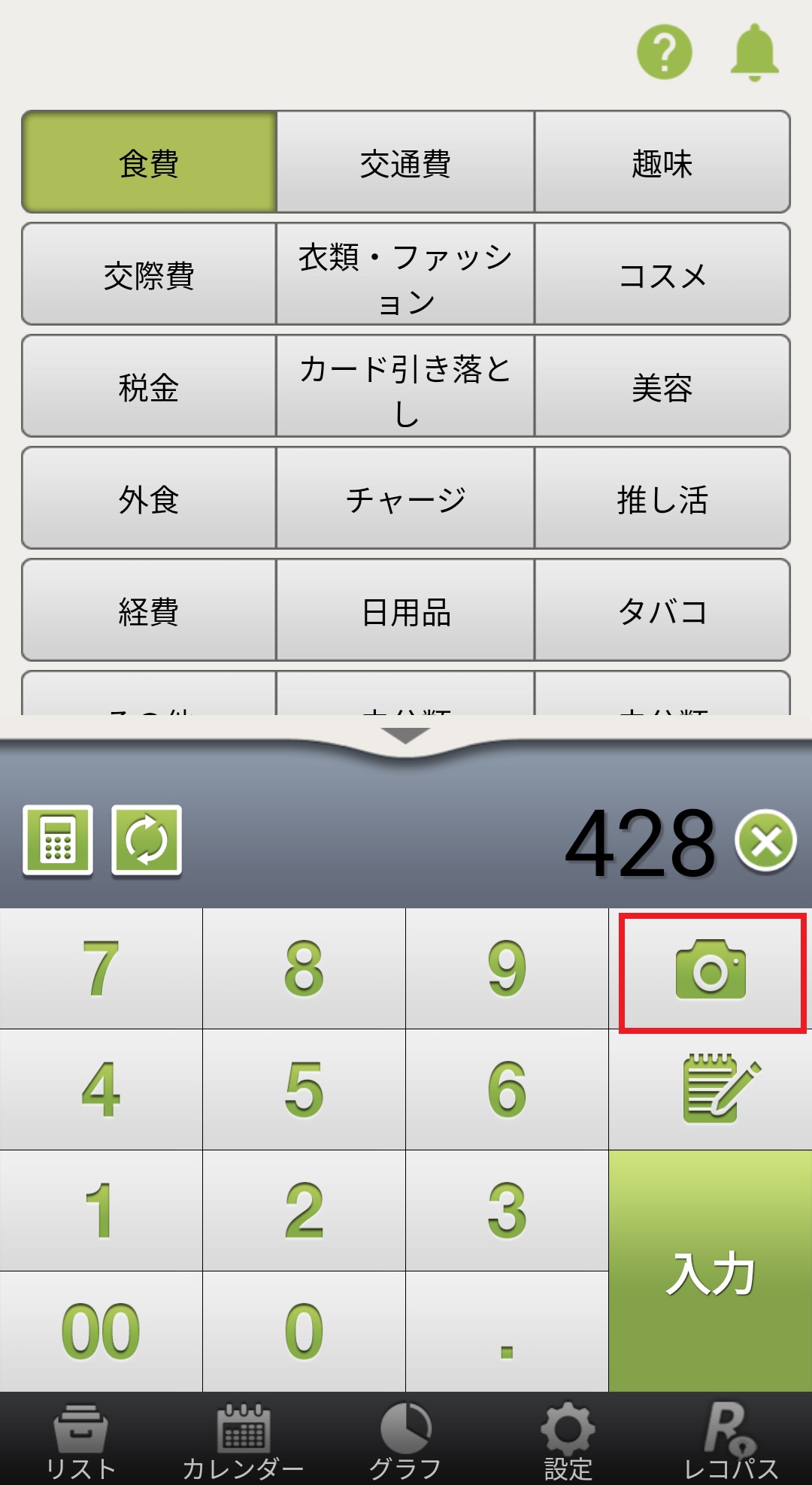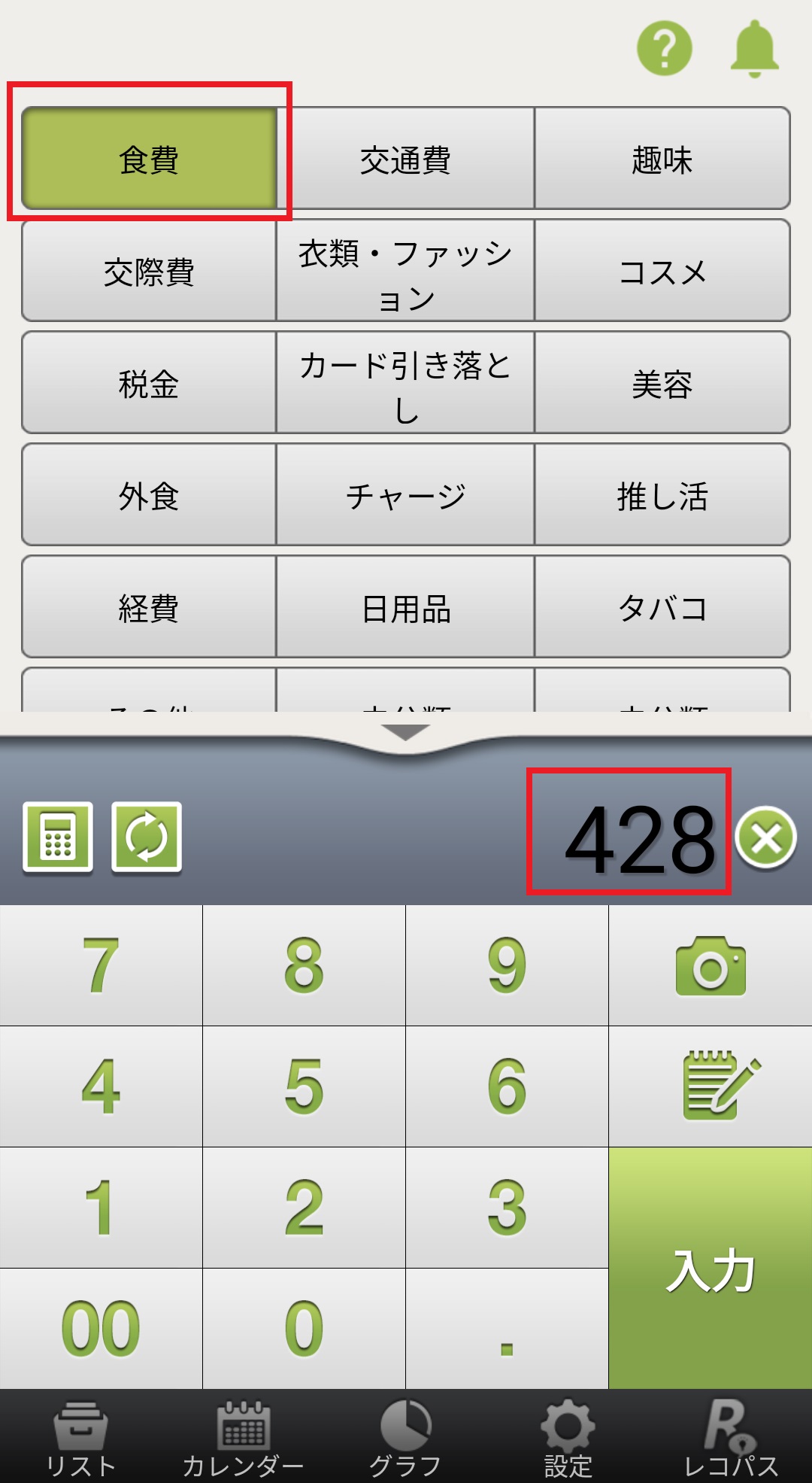 1.おカネレコを起動し、カテゴリーを選択し、金額を入力してください。
