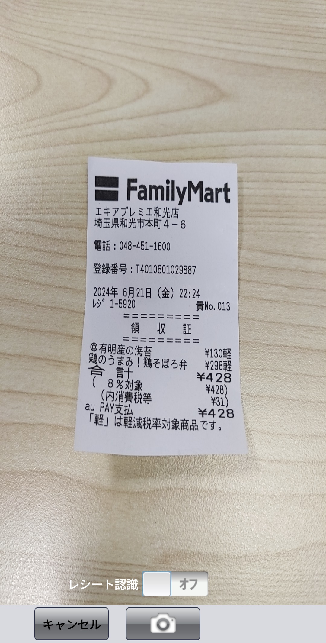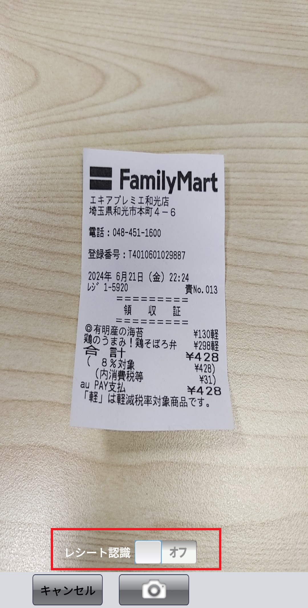 3.レシート読み取りを行わない場合、カメラ画面の中央下にある「レシート認識」をオフにしてください。