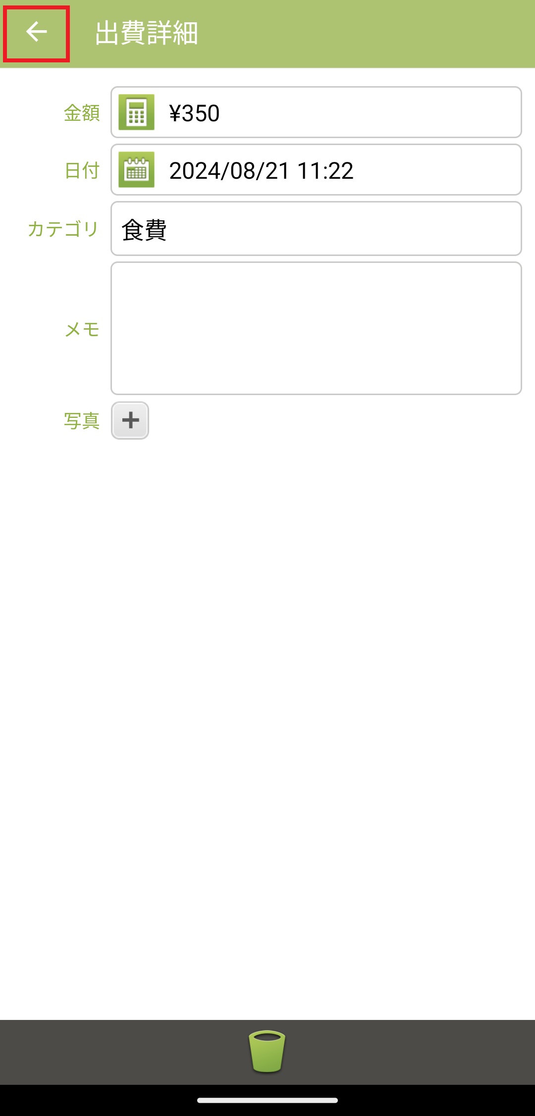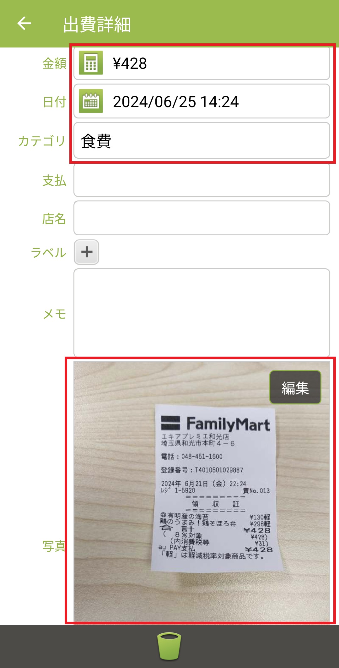 ※デフォルトでは、「カテゴリー、金額、メモ」が設定されています。その他に「支払方法、店名、ラベル」を入力時に登録できます。入力項目の設定はおカネレコの「設定」にて変更できます。