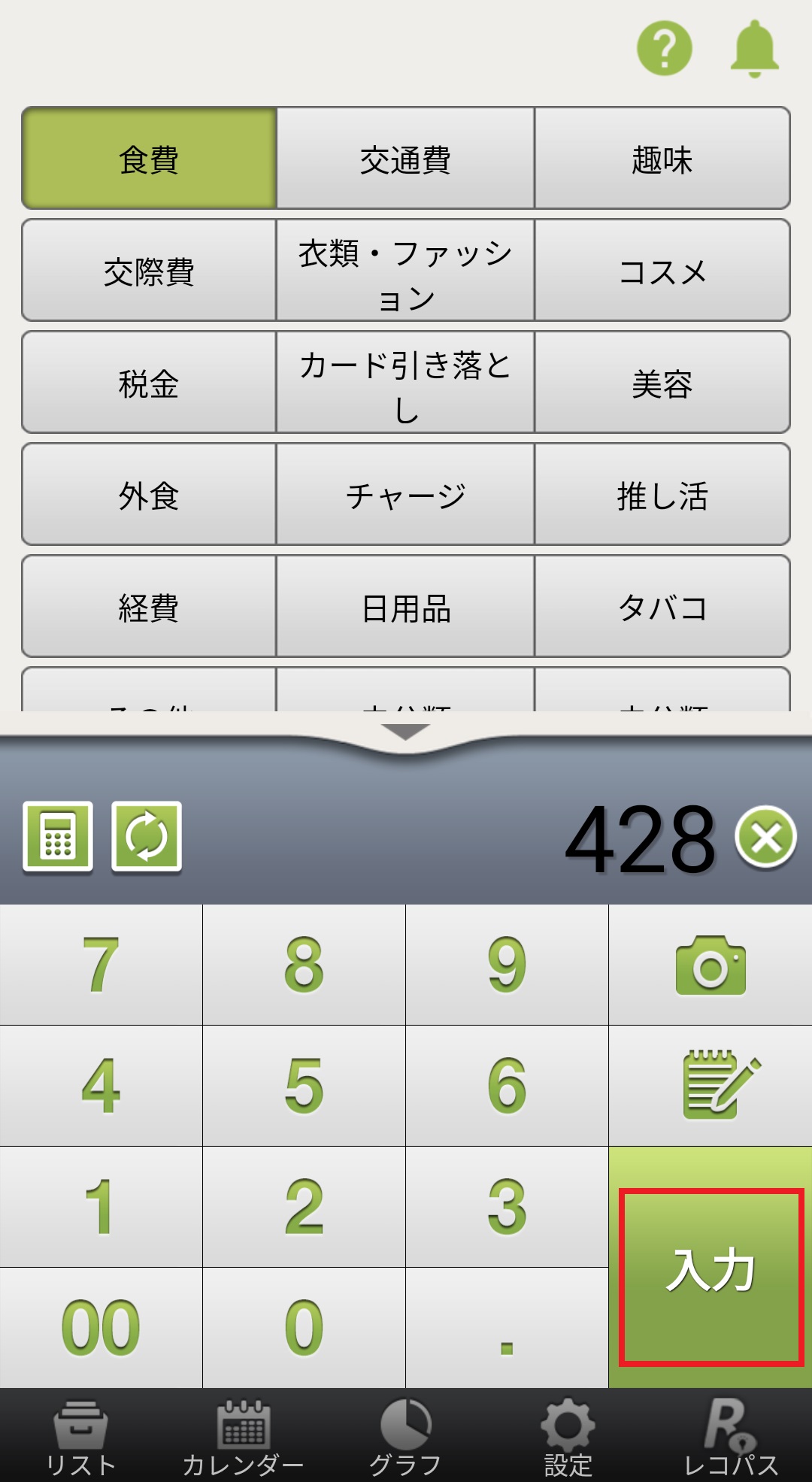 1. おカネレコ起動後、カテゴリーの選択と金額の入力をします。