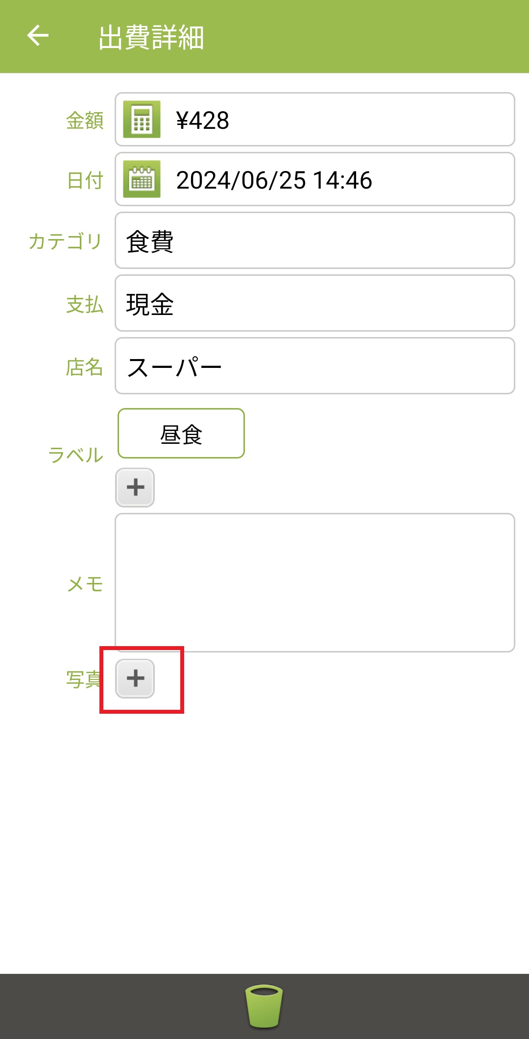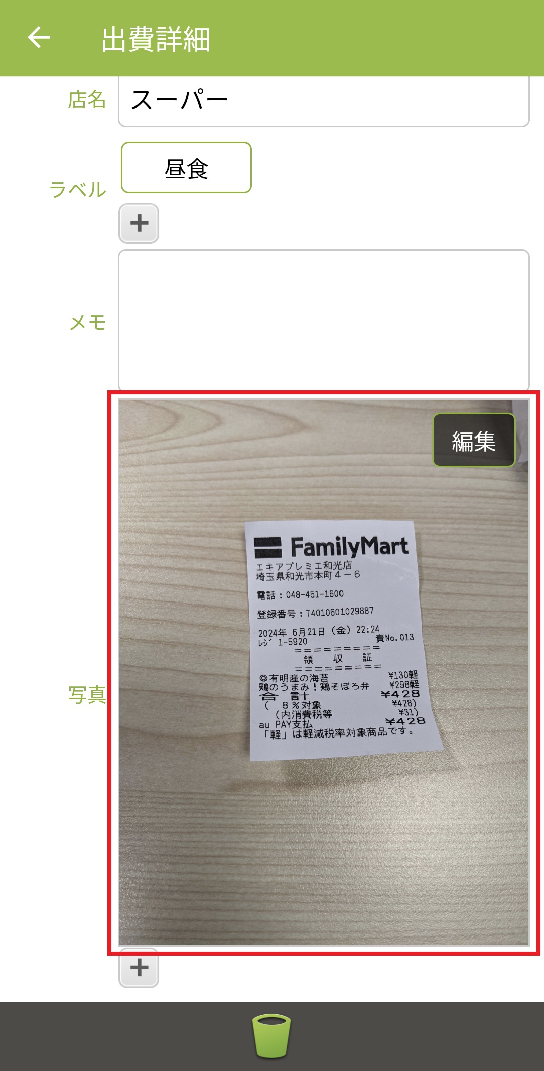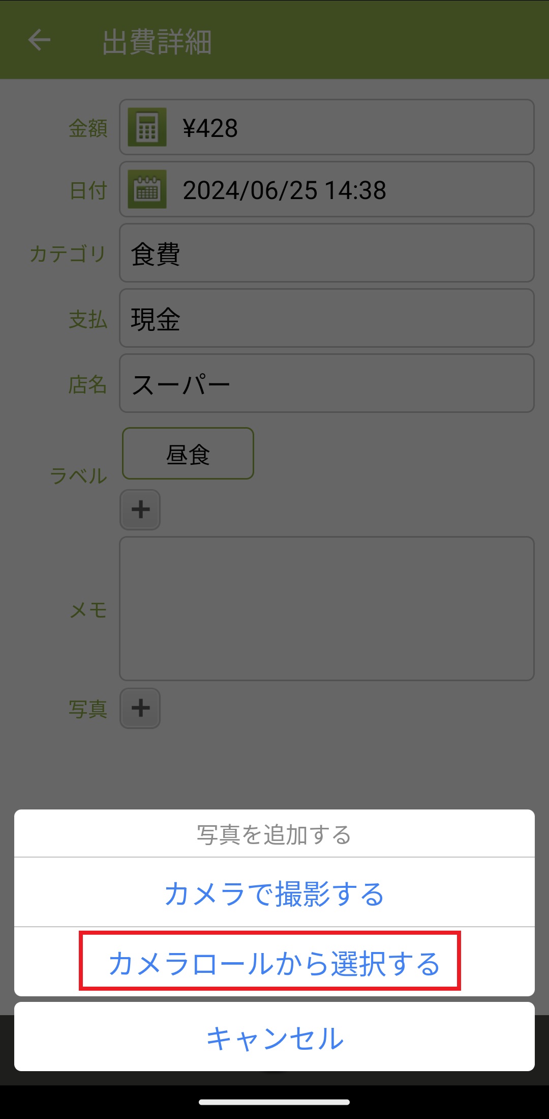 6.「出費詳細」画面に自動で戻り、選択された写真が添付されます。