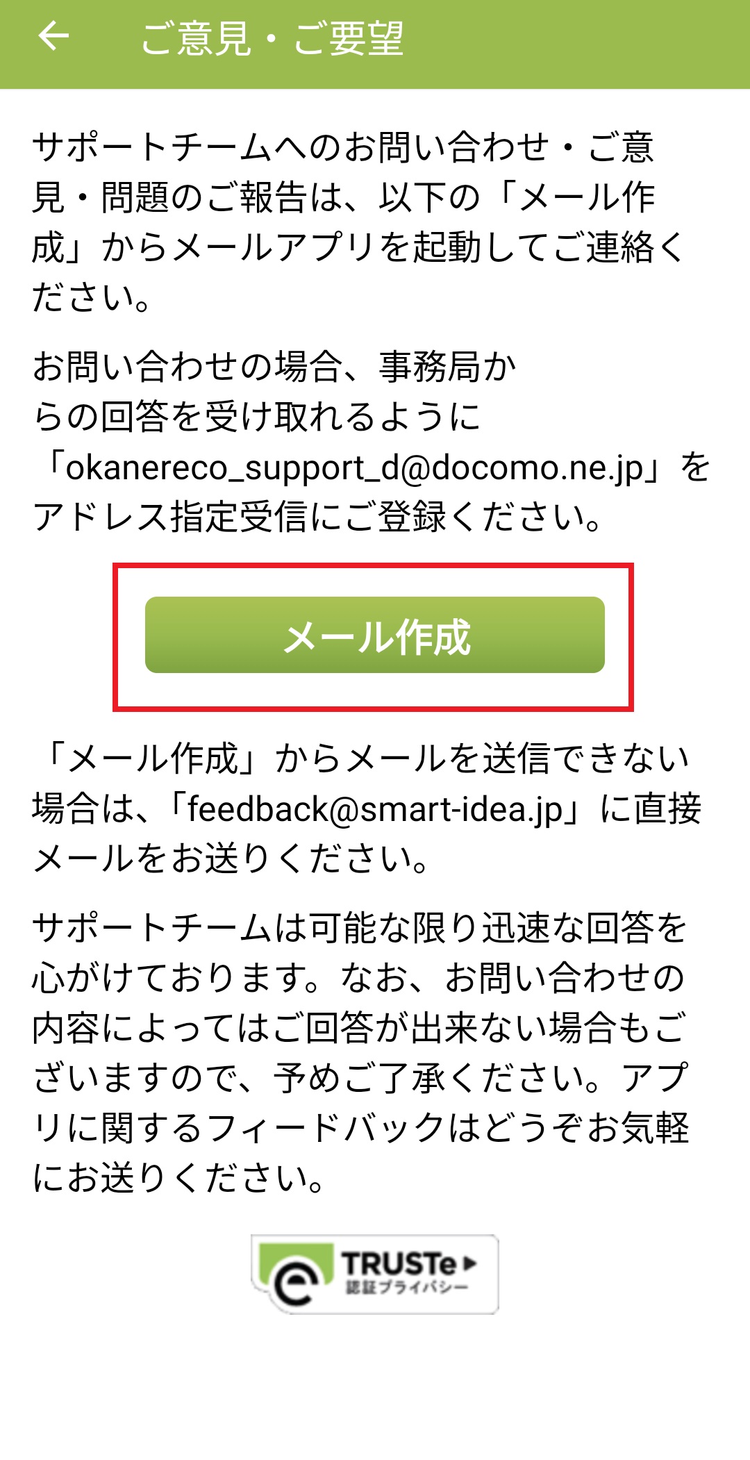 もしも、過去にポイントでプレミアム機能をご交換いただいた覚えがなく、ステータスに「有料機能購入済み」と表示されている場合は、お客様がご利用のアプリ情報やご状況を確認させていただくため、下記の手順で弊社へお問い合わせくださいませ。