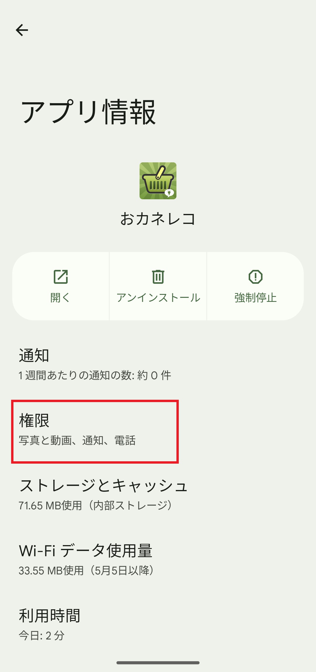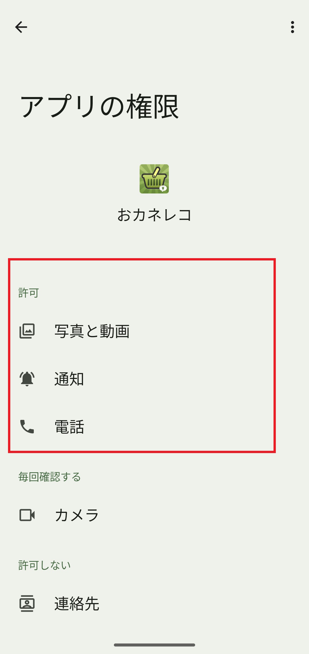 5. 「電話」「ストレージ」の権限がオフの場合は権限許可(オン)にご変更ください。