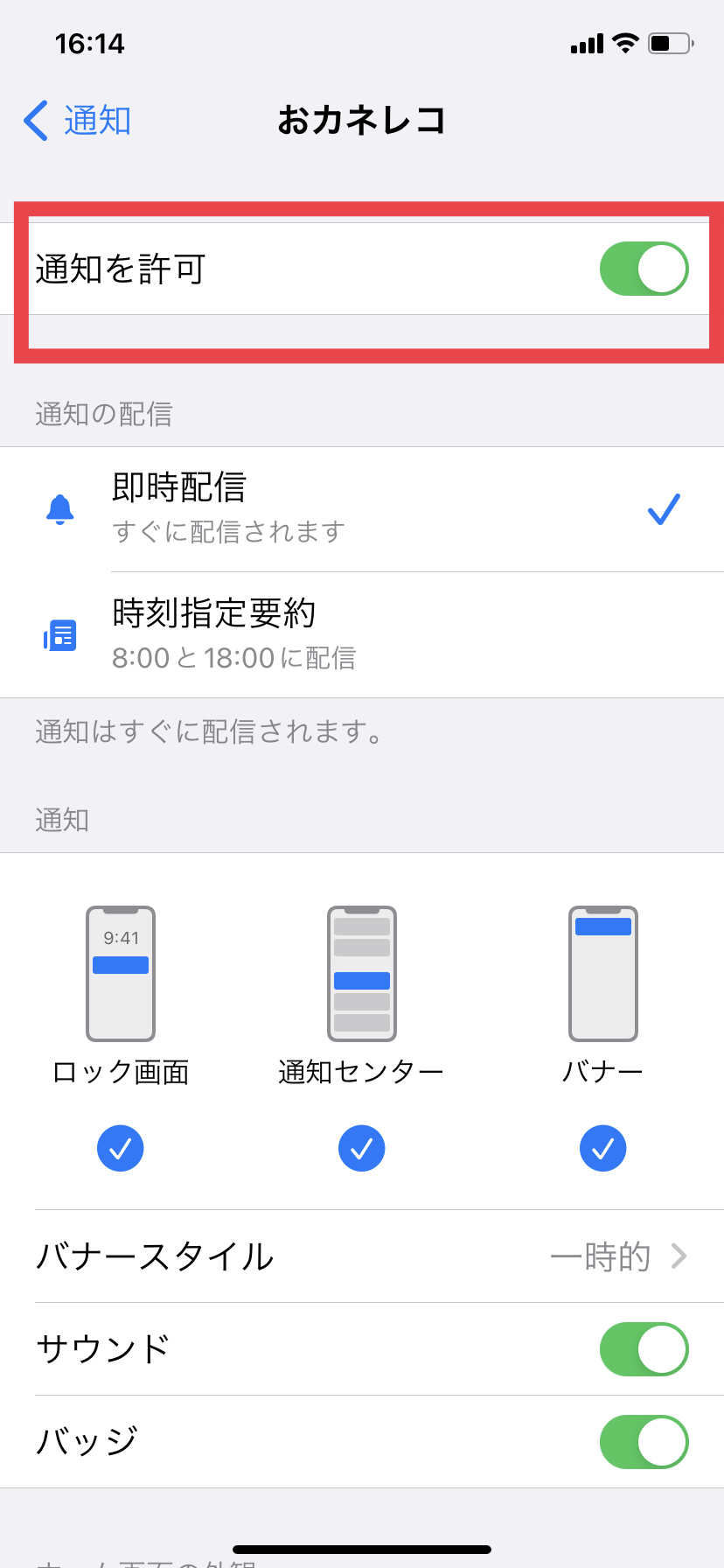 4. 「通知を許可」がオフになっている場合はオン(緑色)にご変更ください。