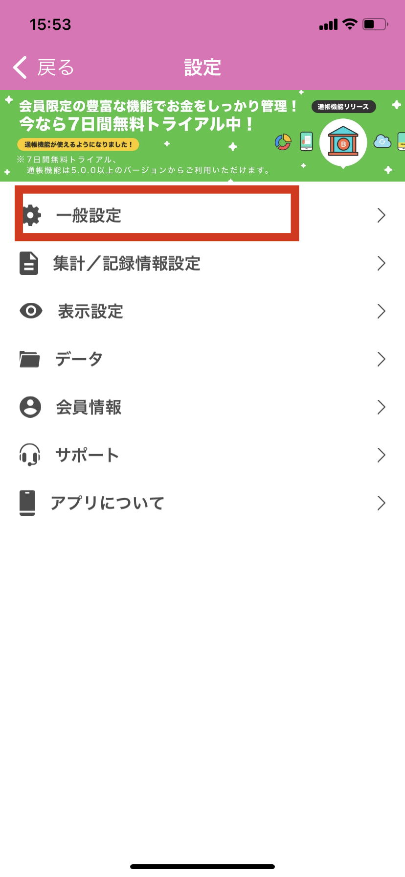 1. おカネレコを起動し、トップ画面上部の「歯車」ボタンを押します。