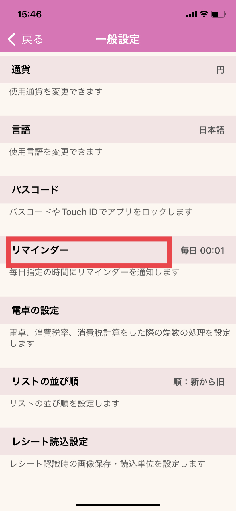 おカネレコでは毎日指定の時刻にリマインダーを送る機能があります。