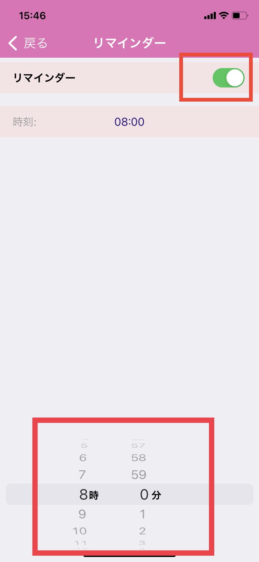 リマインダーの時間は自由に変更可能です。機能をオフにすることも出来ます。