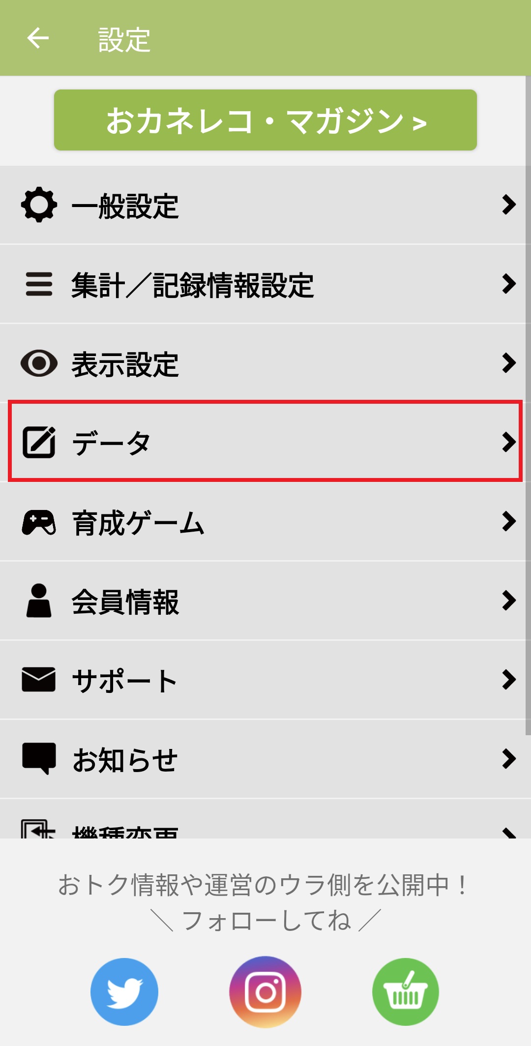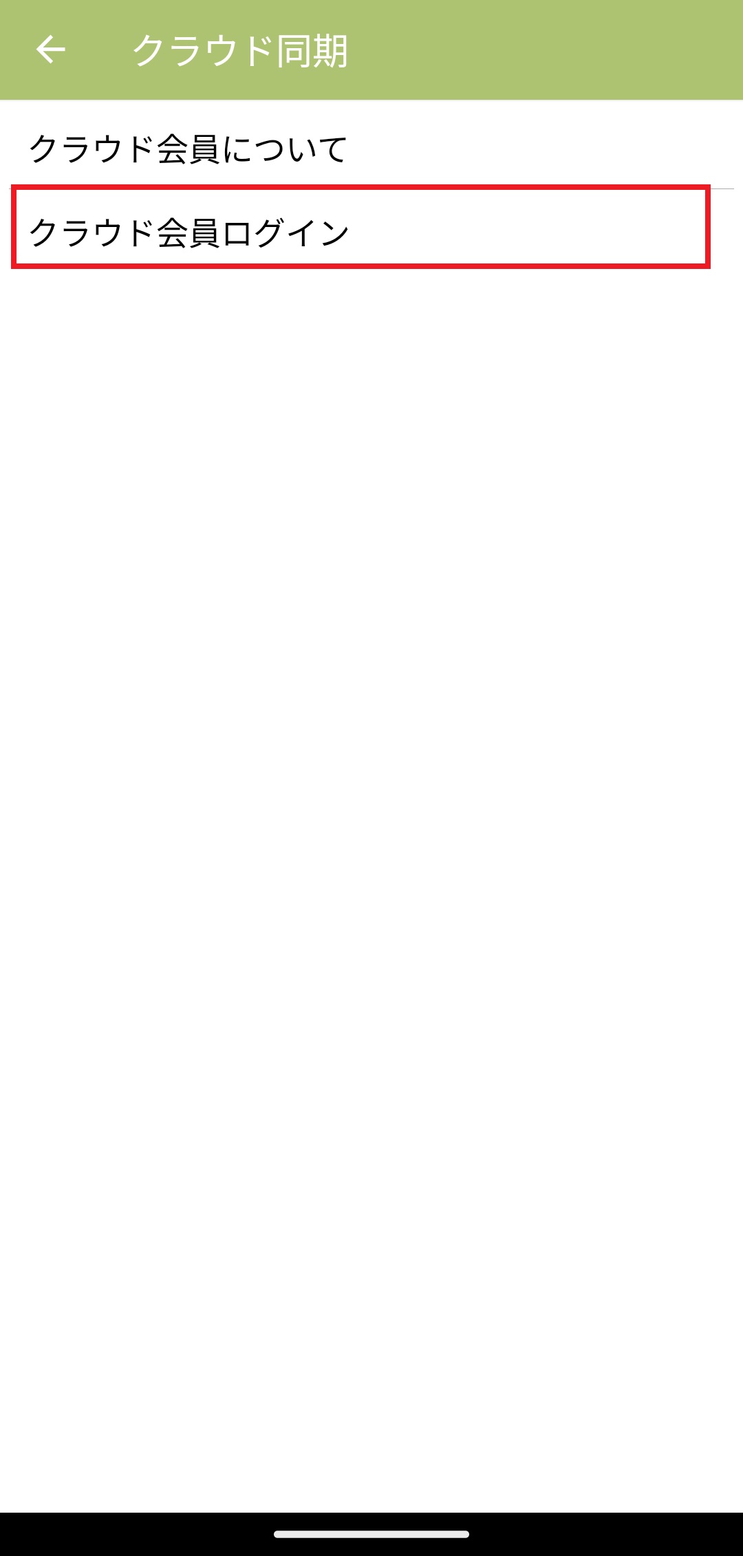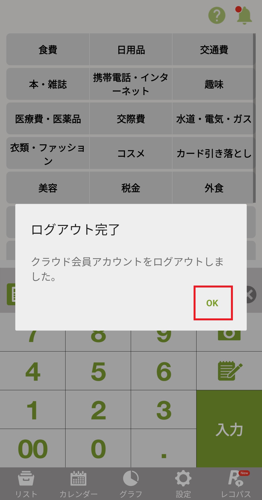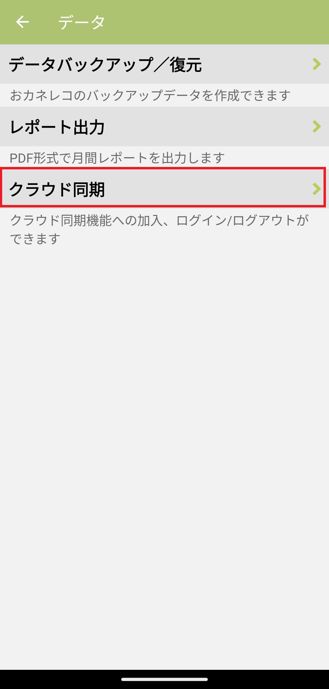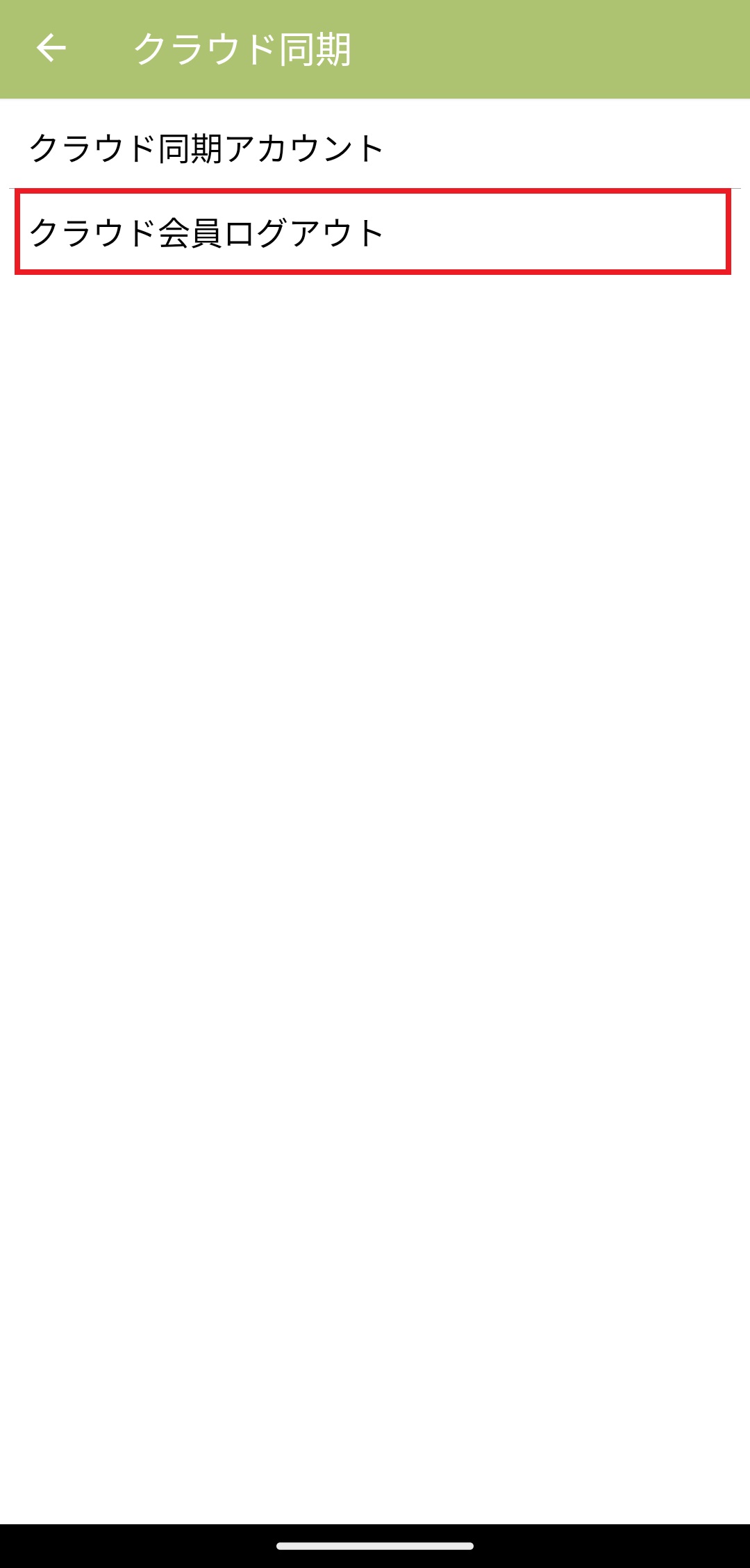 クラウドアカウントからのログアウト方法 Android版 2024/08/28 ▼ クラウドアカウントからのログアウト 1. おカネレコを起動し、入力画面下部の設定(歯車アイコン)を押します。 2. 「データ」を 押します。 3. 一番下の「クラウド同期」を 押します。 4. 「クラウド会員ログアウト」を 押します。 5.「ログアウト完了」の表示がでたら、「OKボタン」を押します。 ※ 既にログアウトされている場合は「クラウド会員ログイン」と表示されます。