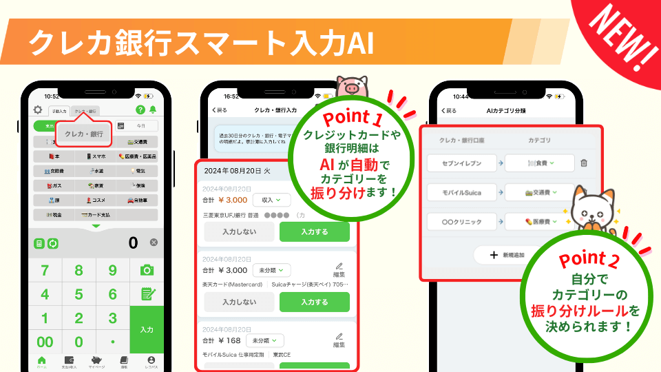 新機能①『クレカ銀行スマート入力AI』:クレジットカードや銀行履歴から自動的にAIがカテゴリー分類を行います。これにより、面倒な入力作業が大幅に軽減され、レシートの保管も不要になります。