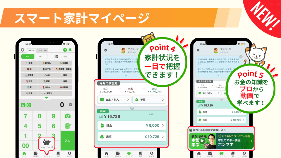 新機能③『スマート家計マイページ』:自分の家計状況を一目で把握できる新機能です。また、動画でプロから学べる本気のマネー講座「ホンマネ」も追加!スマホでいつでも手軽にお金の勉強をできます。