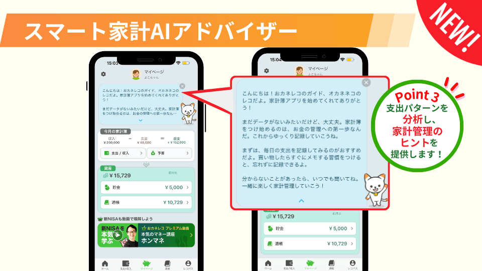 新機能②『スマート家計AIアドバイザー』:毎日の家計についてアドバイスを提供します。あなたの支出パターンを分析し、より効果的な家計管理のヒントを提供します。