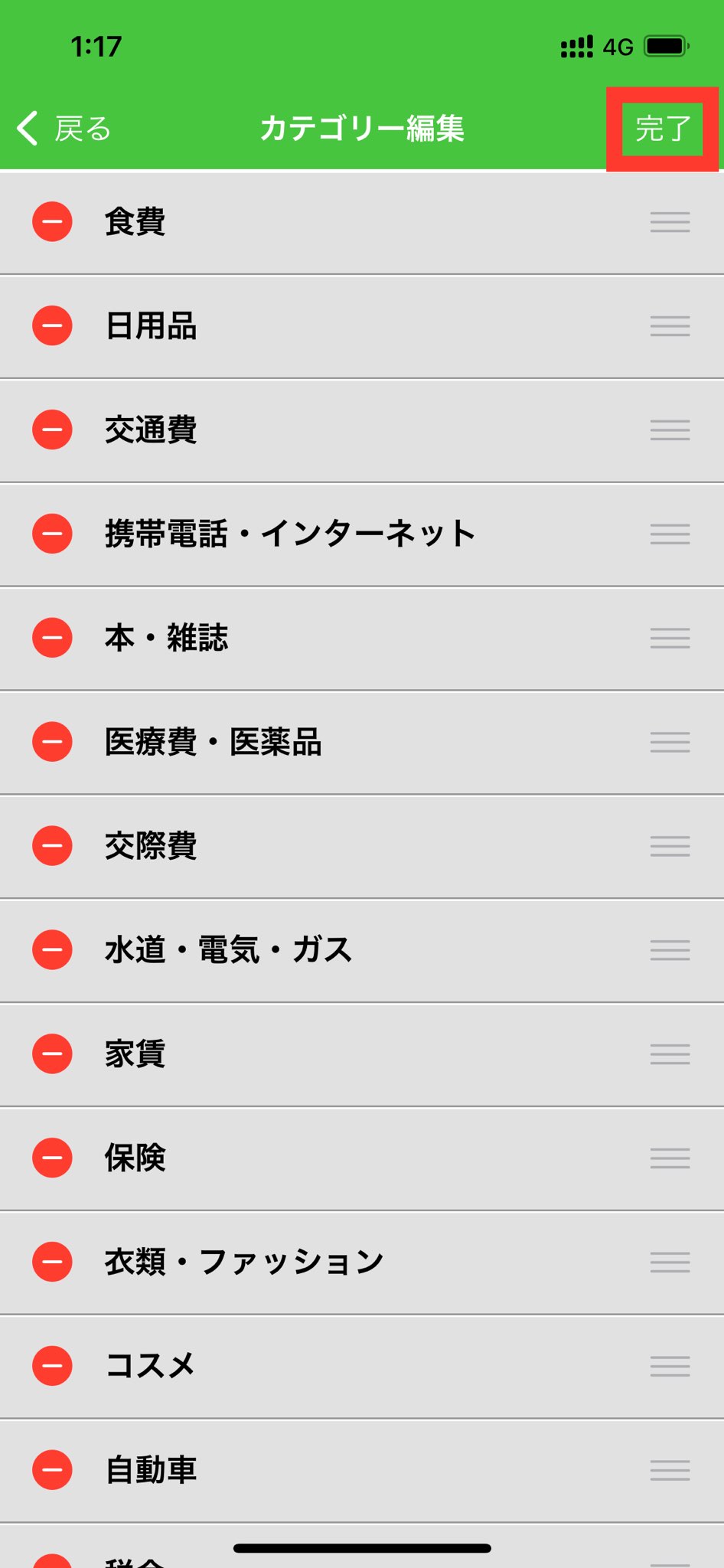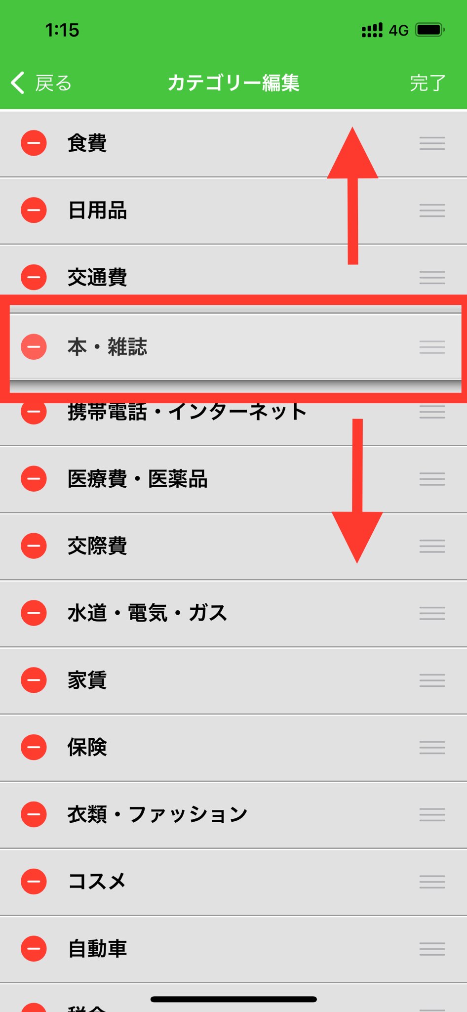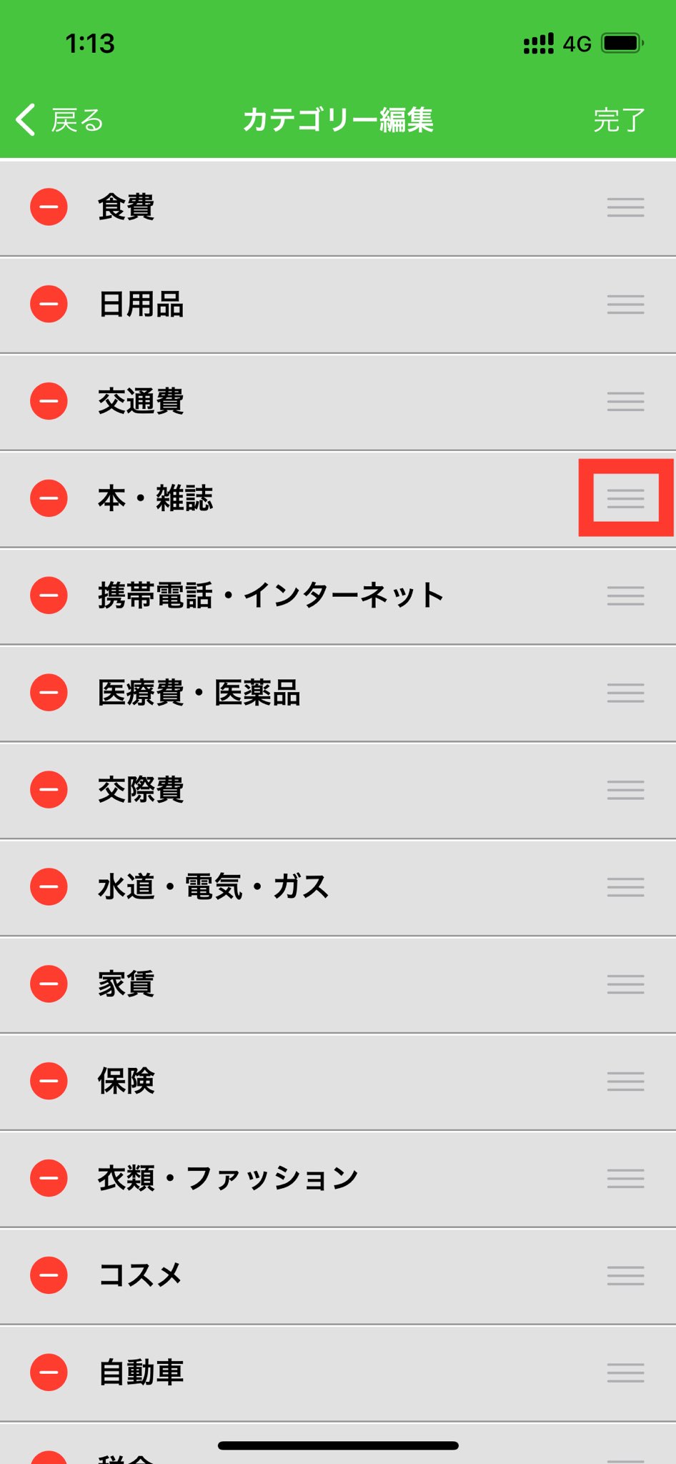 4. 並べ替えたいカテゴリーの右側の三本線(三)を長押しします。