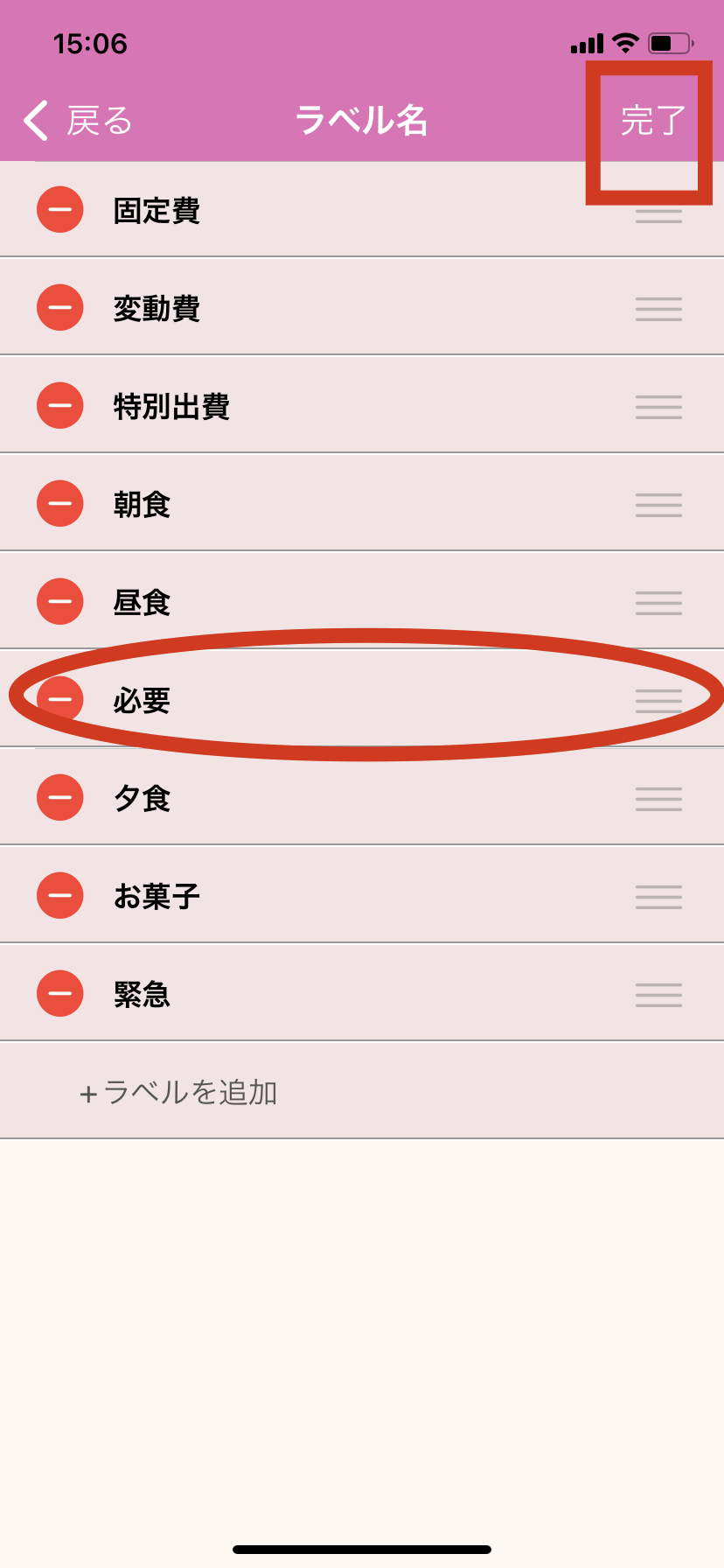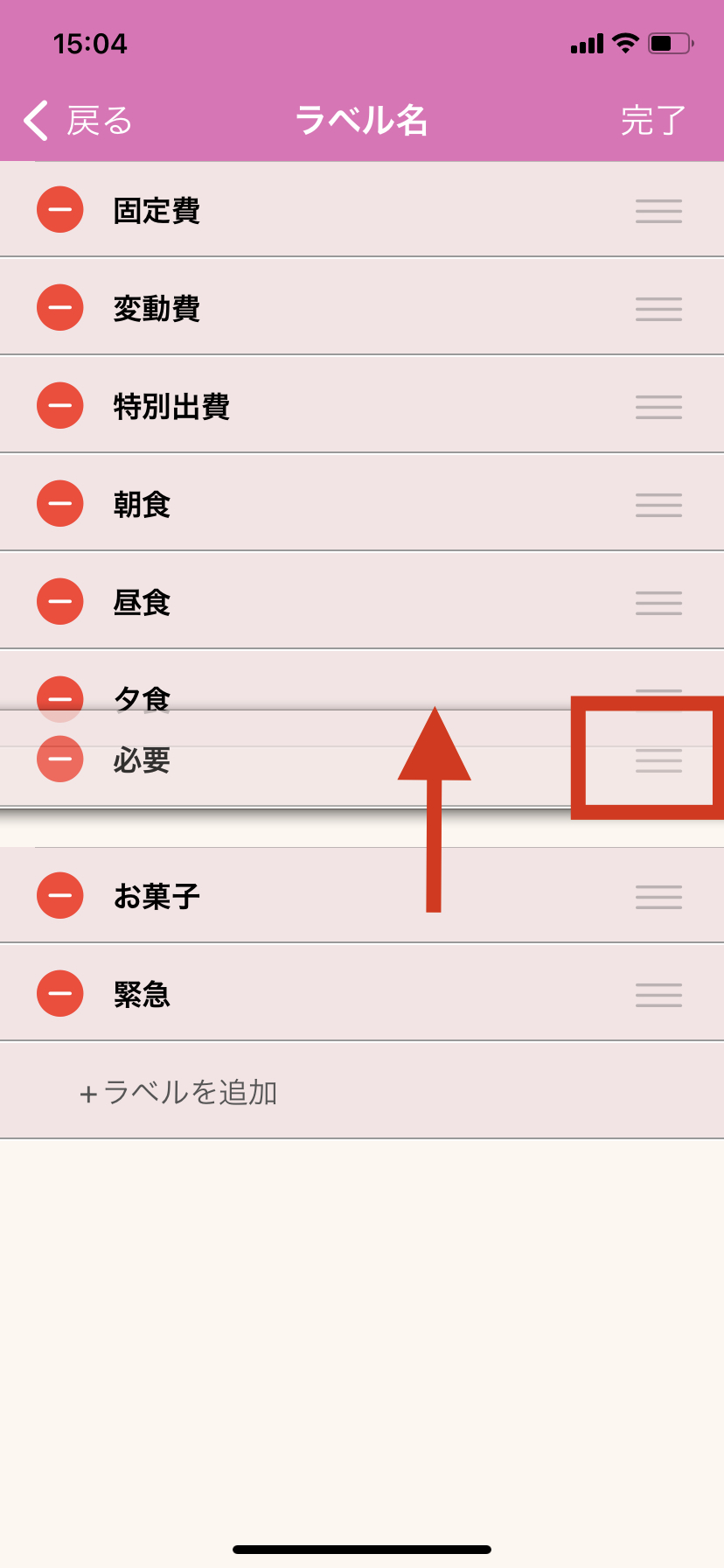 ラベルの並び順を変更する方法 機能をカスタマイズする 2021/06/14 【ラベルの並び順を変更する】 1. おカネレコを起動し、トップ画面上部の「歯車」ボタンを押します。 2. 「集計/記録情報設定」を押します。 3.「ラベル設定」を押します。 4.「ラベルリスト」を押します。 5. 右上の「編集」を押します。 6. 並び替えたい項目の右端の編集マーク(三本の横線)を押し、移動したい場所へスワイプ(指で押したまま、スライドさせる)します。 7. 並び替えが完了したら右上の「完了」を押します。