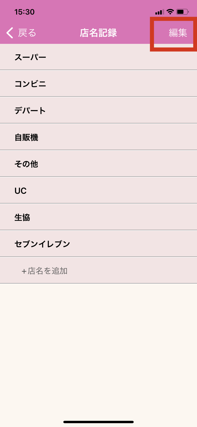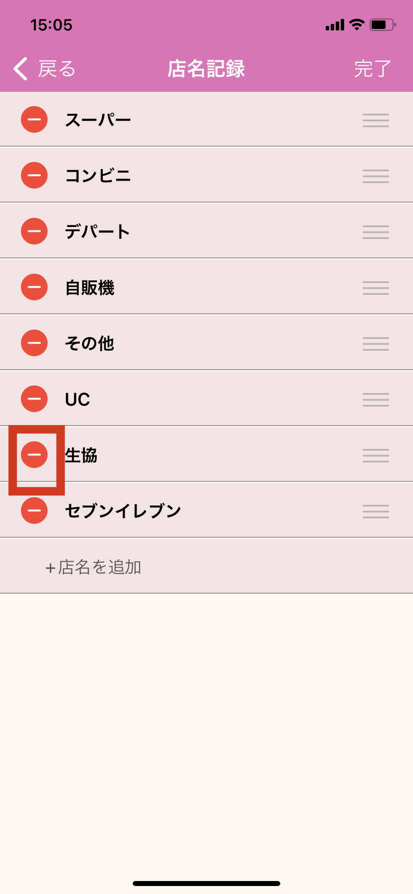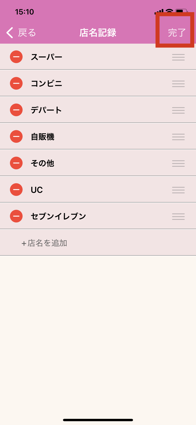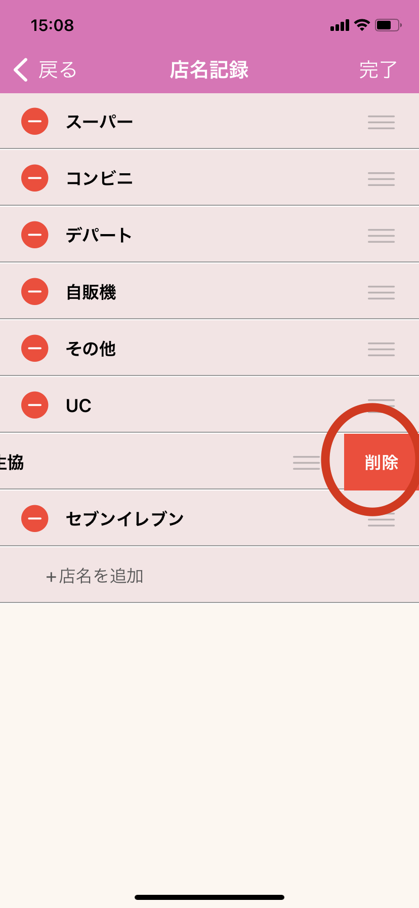 店名リストを削除する方法 機能をカスタマイズする 2021/06/14 1. おカネレコを起動し、トップ画面上部の「歯車」ボタンを押します。 2. 「集計/記録情報設定」を押します。 3.「店名設定」を押します。 4.「店名リスト」を押します。 5.「編集」ボタンを押します。 6.リストの左端に表示される赤い丸のボタンを押します。 7.リストの右端に「削除」ボタンが表示されるので、「削除」を押します。 8.画面右上の「完了」ボタンを押して削除完了です。