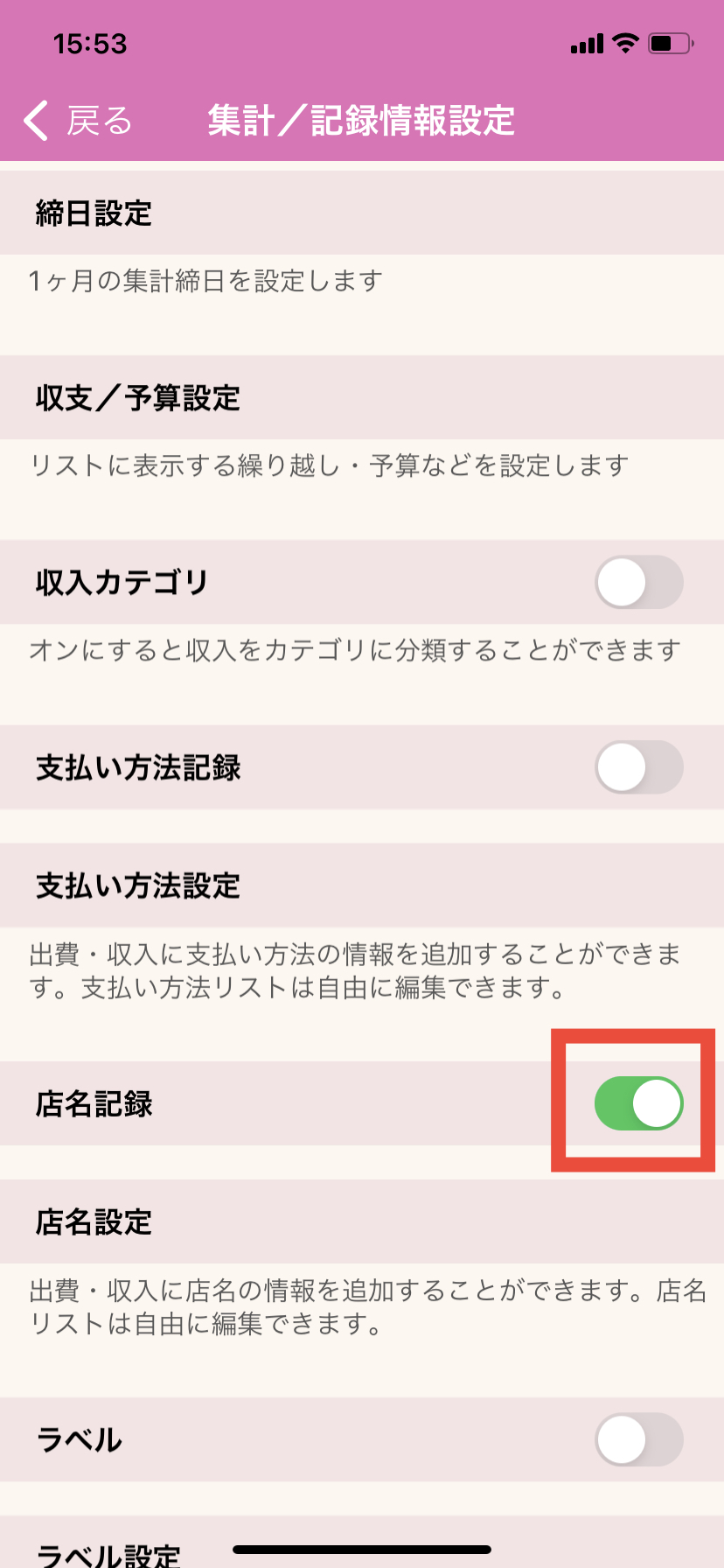 3.「店名記録」をオン(緑色)にします。
