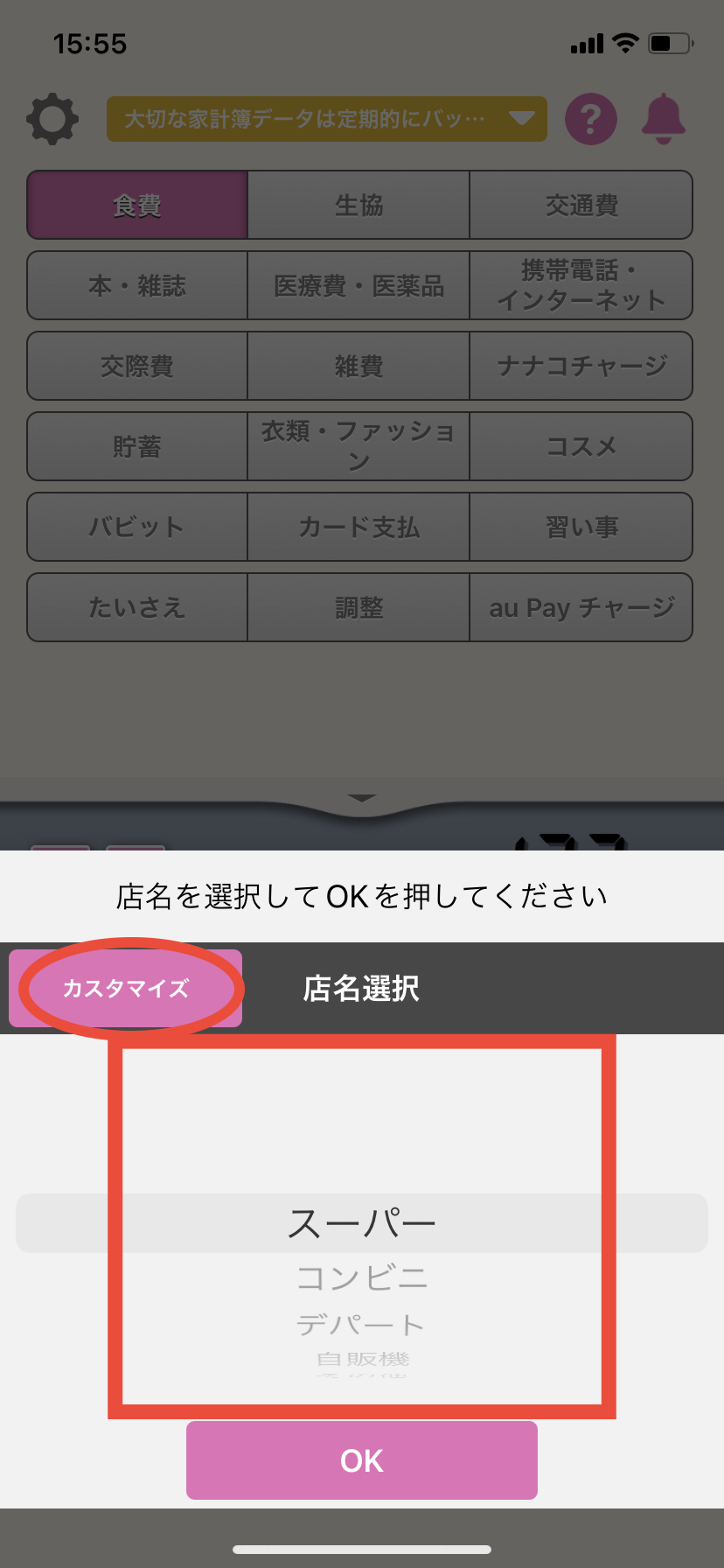 5.店名選択の画面の左端に表示される「カスタマイズ」ボタンを押すと店名の編集が可能です。