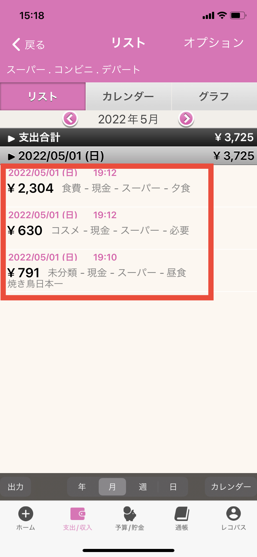 1. おカネレコ起動後、トップ画面左下の「支出/収入」を押します。