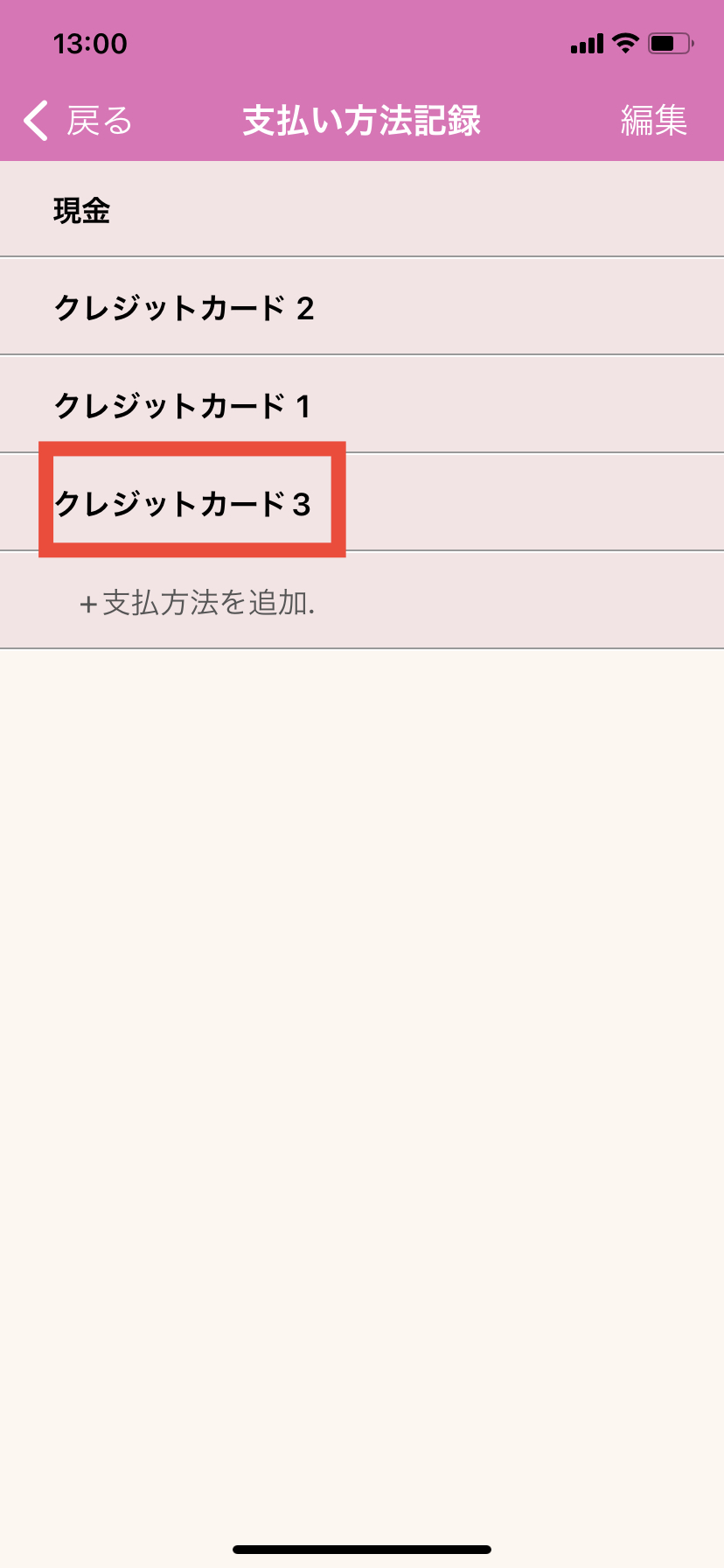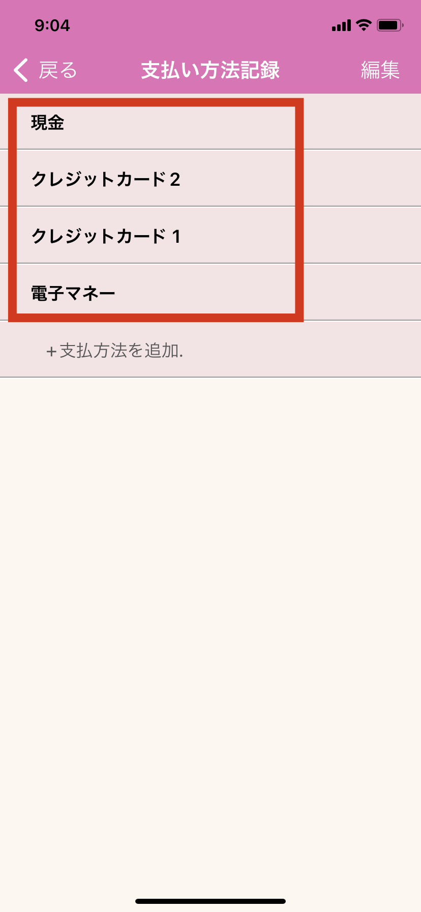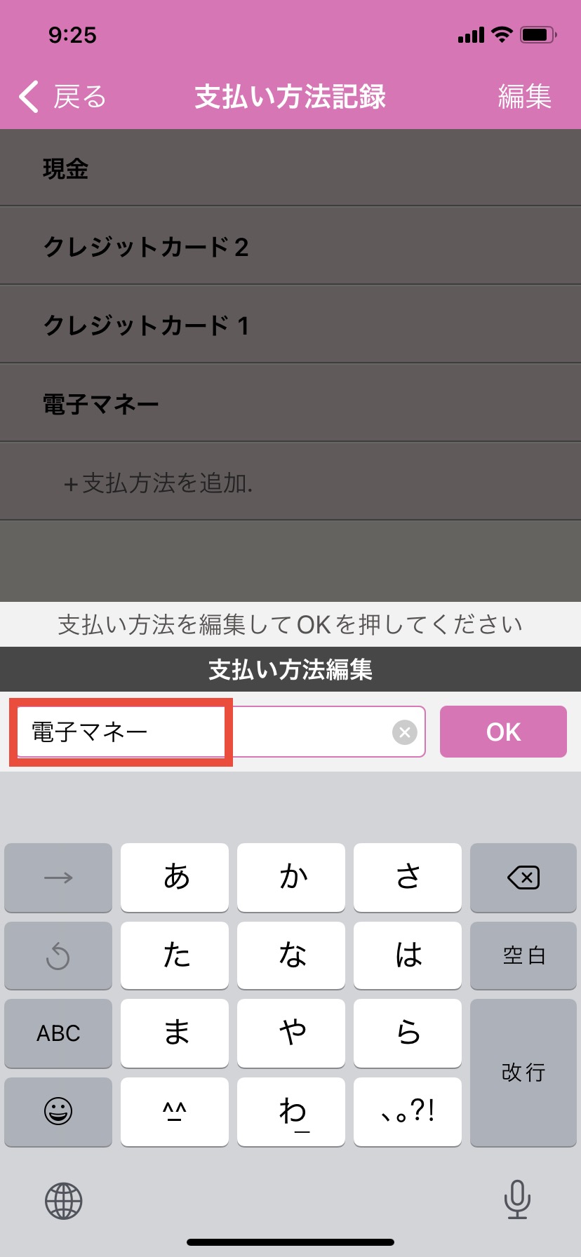 支払方法名を変更する方法 機能をカスタマイズする 2021/06/25 【支払い方法名を変更する】 1. おカネレコを起動し、トップ画面上部の「歯車」ボタンを押します。 2. 「集計/記録情報設定」を押します。 3.「支払方法設定」を押します。 4.「支払方法リスト」を押します。 5. 変更したい支払方法名を選択します。 6. 「支払方法編集」が表示されます。編集欄に支払方法名を入力します。 7. 入力が完了したら「OK」を押し、「<戻る」を押します。 8. 支払方法名が変更されます。
