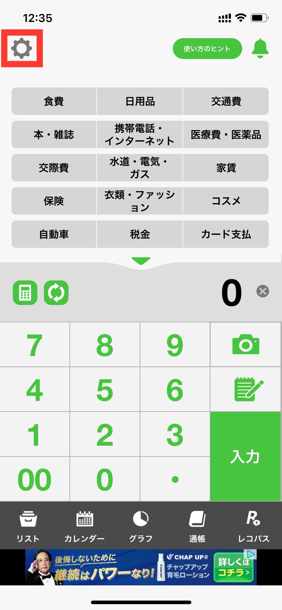 1. おカネレコを起動し、入力画面上部の設定(歯車マーク)を押します。