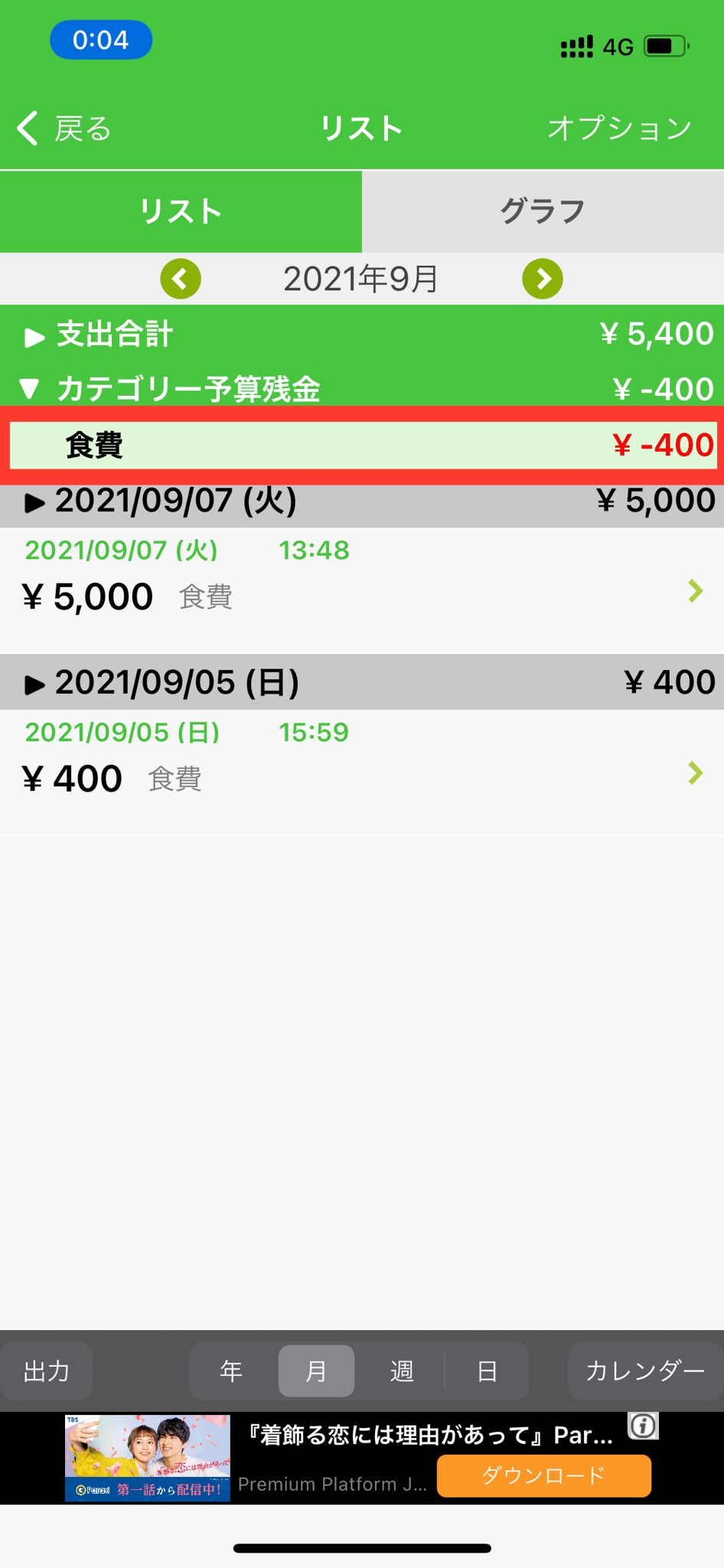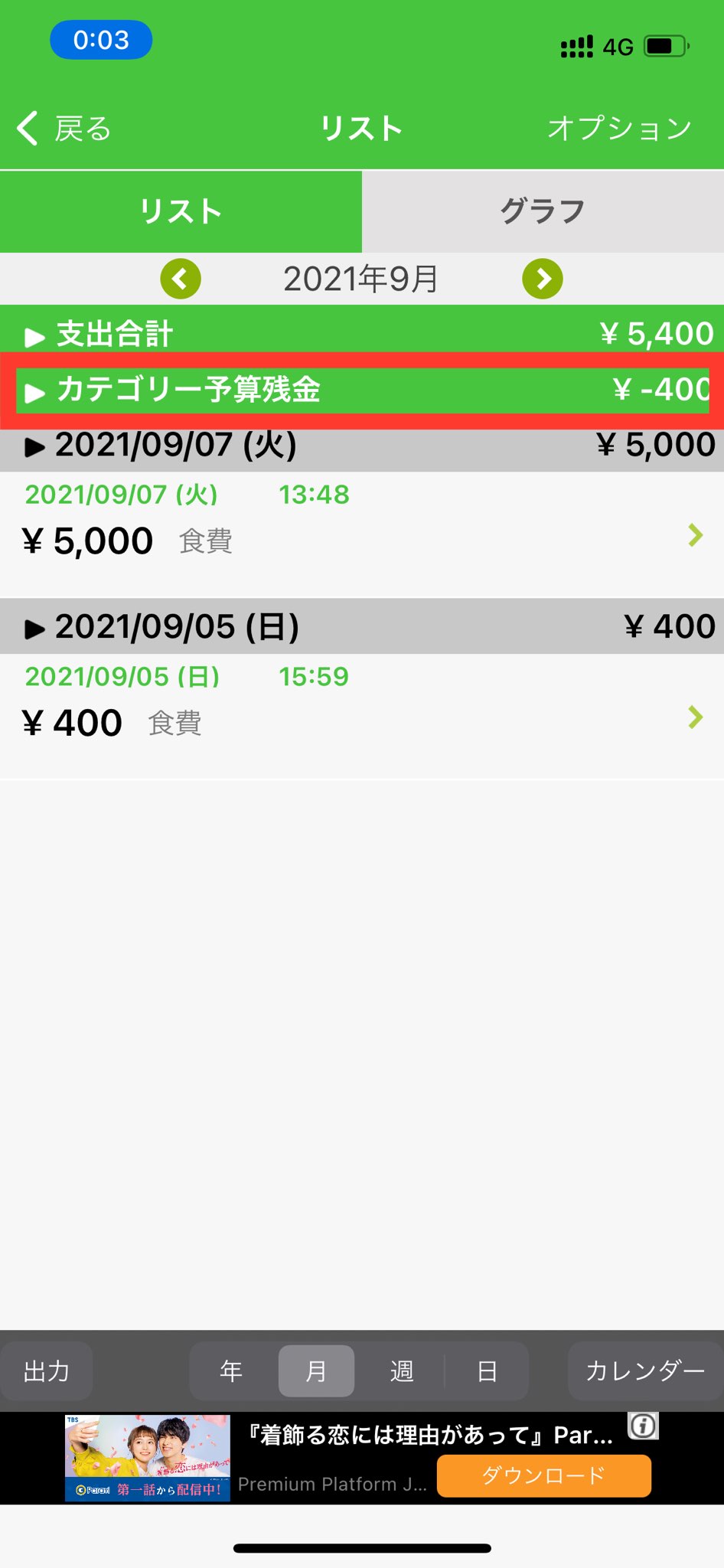 10.リスト画面上部に、カテゴリーの予算残金が表示されます。