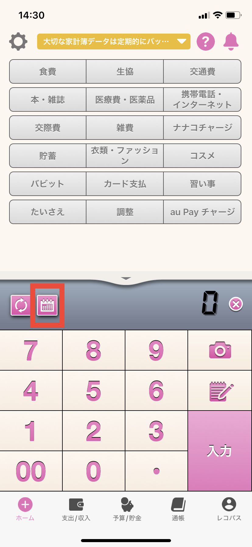 1. おカネレコのホーム画面で「カレンダー」ボタンを押します。