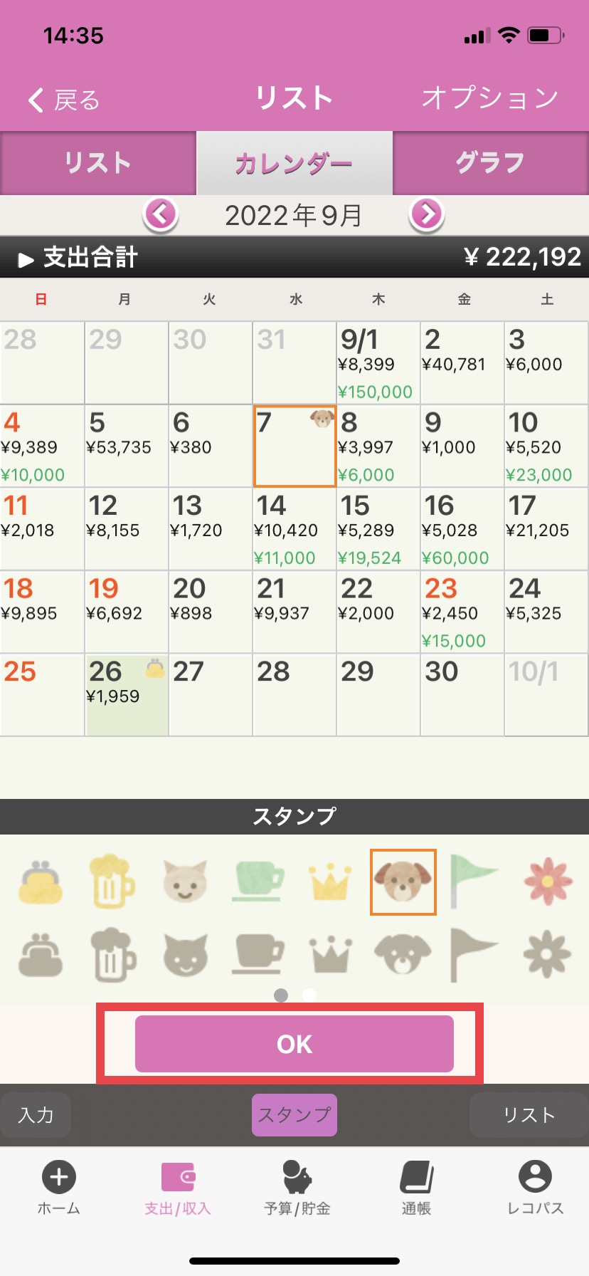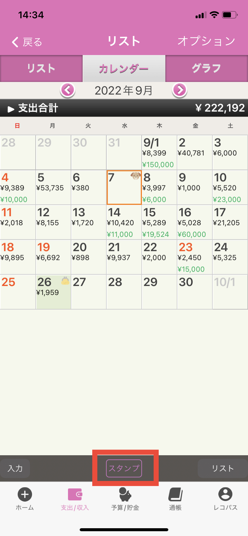 3. 選択した日にオレンジ色の枠がつきます。下段中央の「スタンプ」を押します。