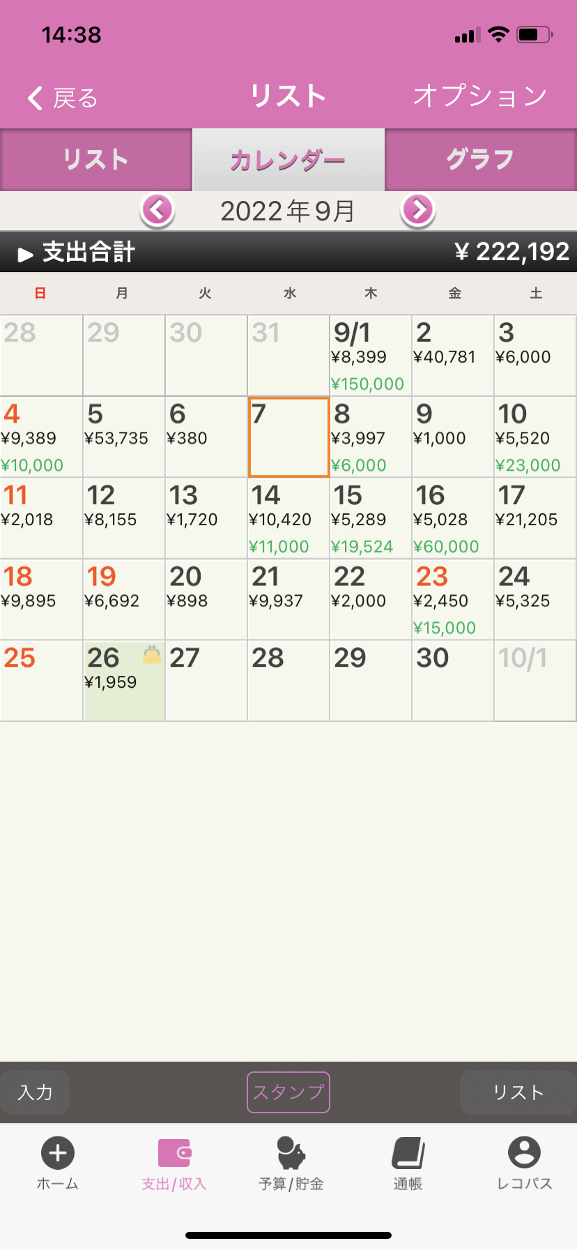 ※カレンダーボタンがない方は右下の「支出/収入」→「カレンダー」を押します。