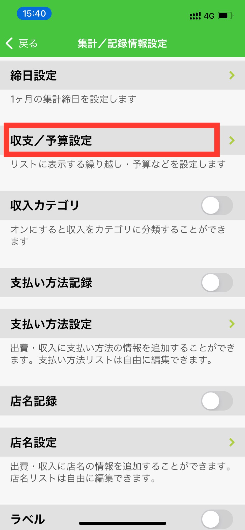 3. 「収支/予算設定」を押します。