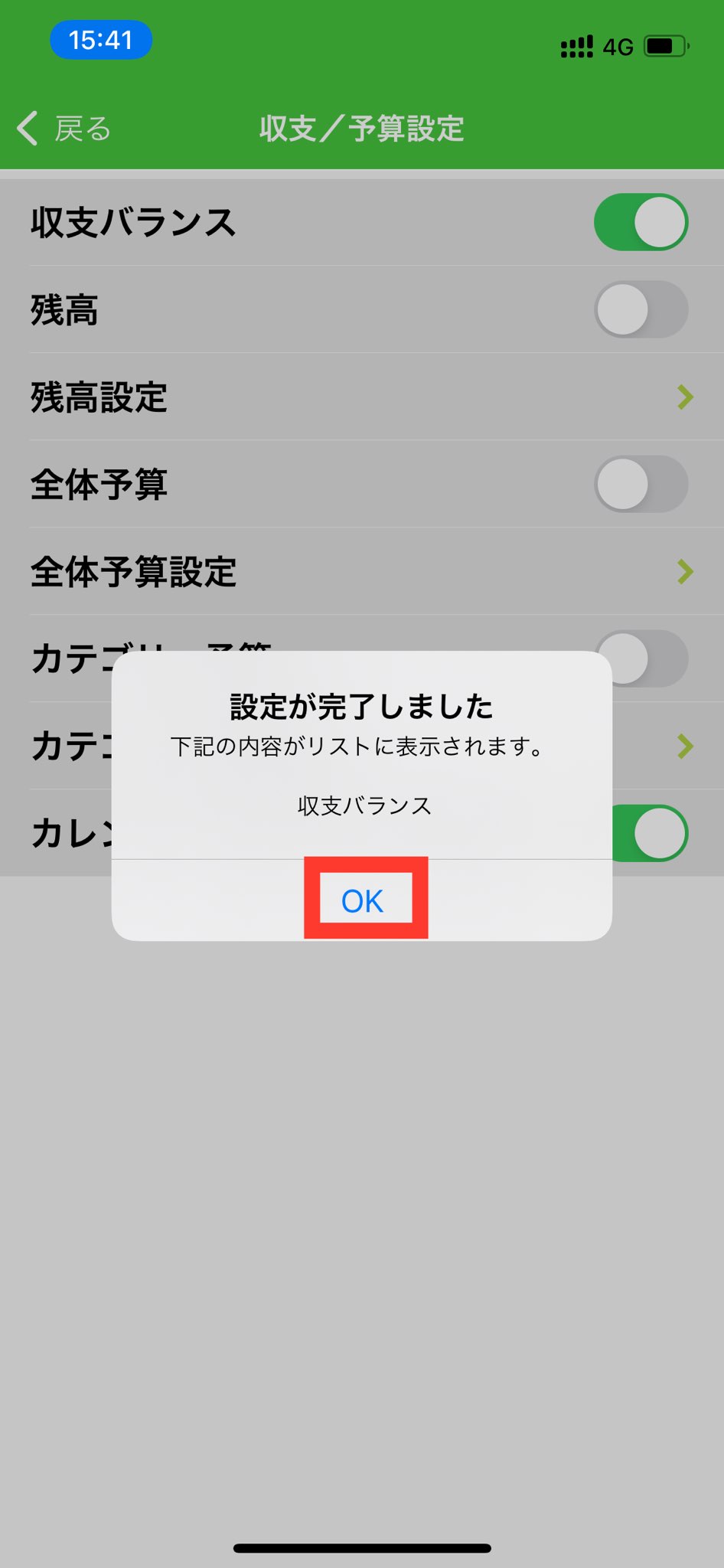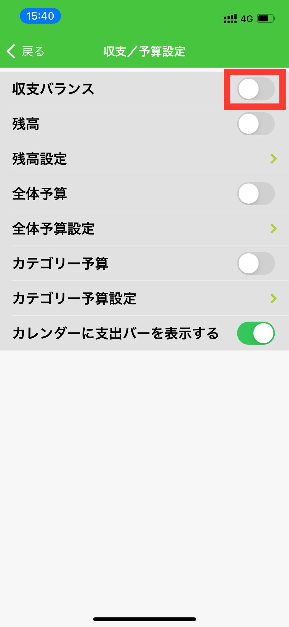 4. 「収支バランス」をオンにします。