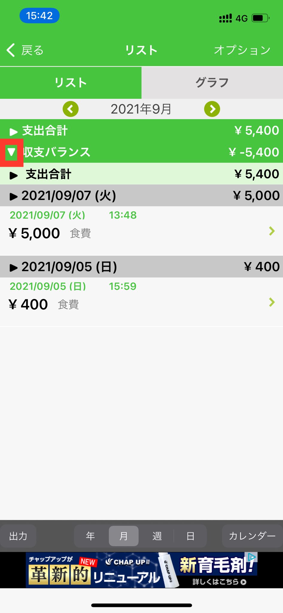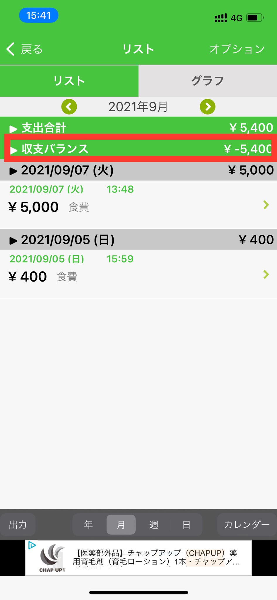 ※収支バランスをオンにされていなくても、出費・収入を両方入力いただいているとグラフ画面では「収入合計」と「支出合計」の下に自動的に「収支バランス」の金額が表示されます。