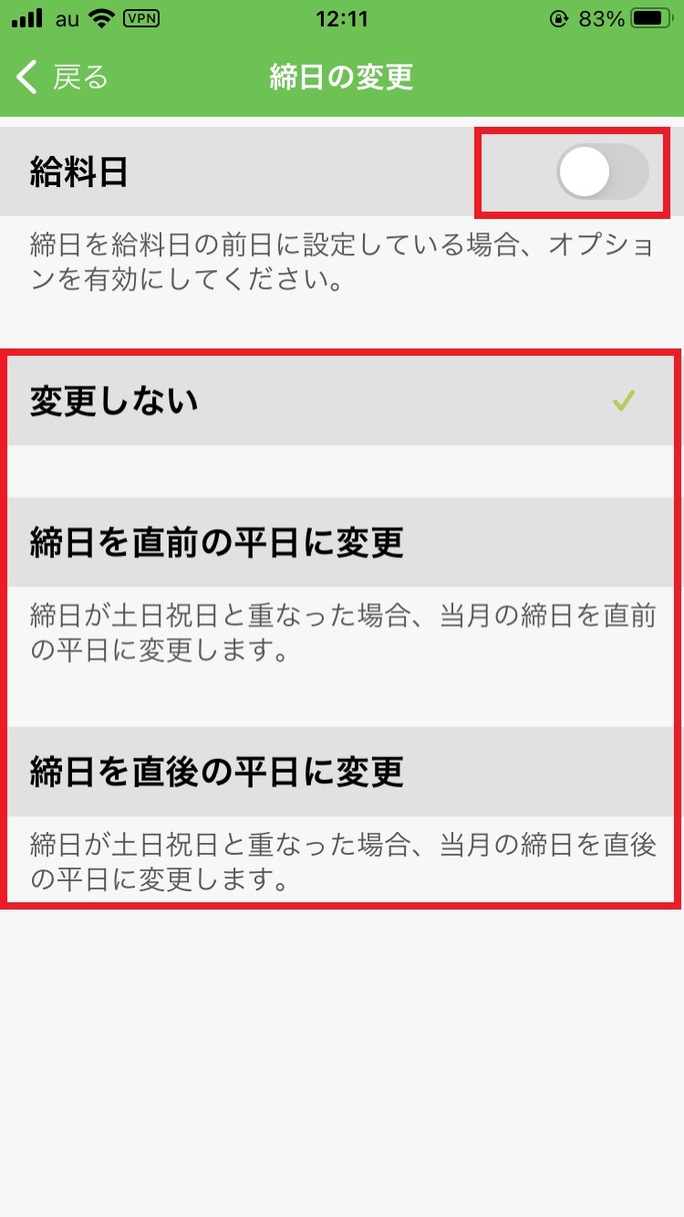 また、締日を給料日の前日又は給料日当日、どちらの場合でも対応できるように「給料日」オプションもあります。