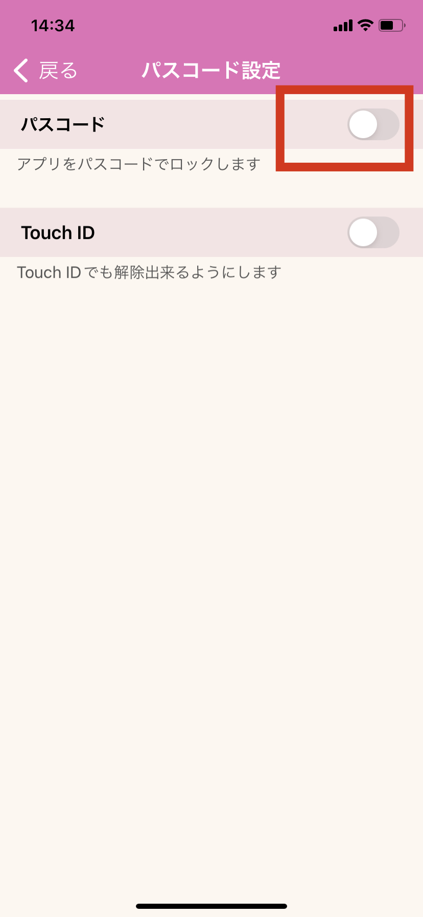 4.パスコードをオンにします。