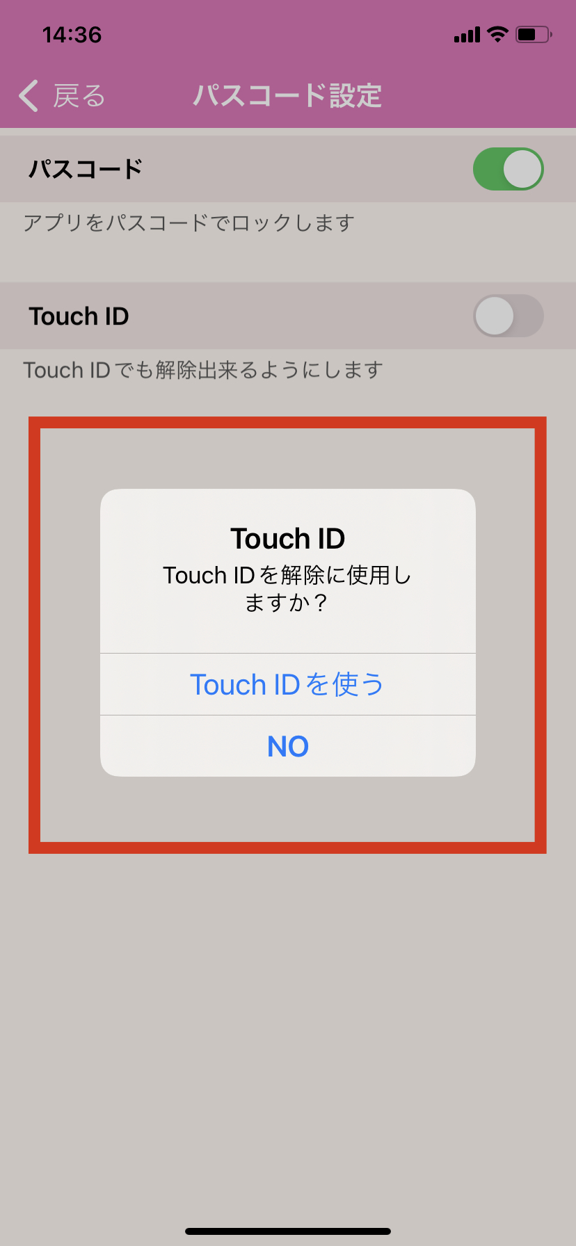 7.Touch IDを解除用に設定される場合は「Touch IDを使う」を押します。→「TouchIDで解除できるようになりました」と表示されます。「OK」を押して完了です。