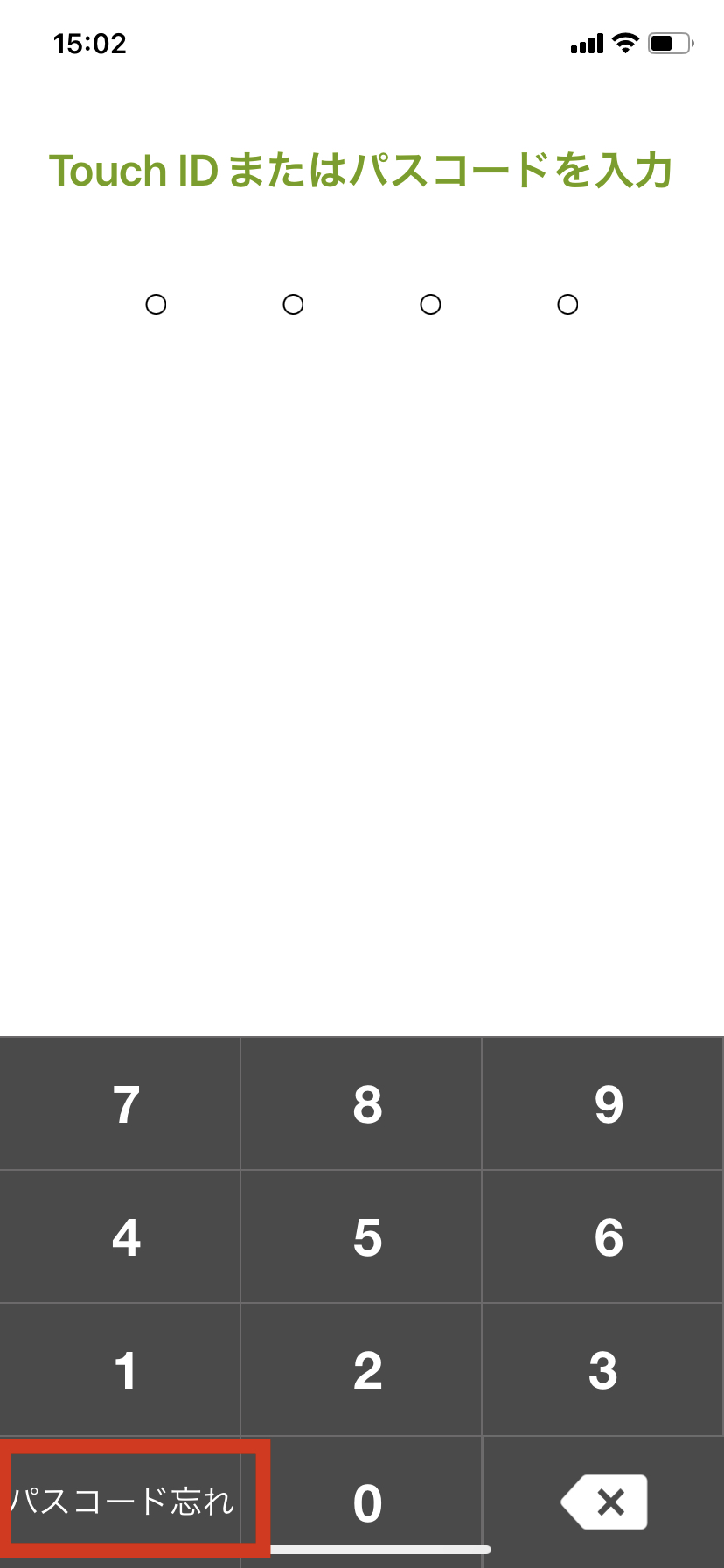 1.パスコード入力画面左下の「パスコード忘れ」ボタンを押します。