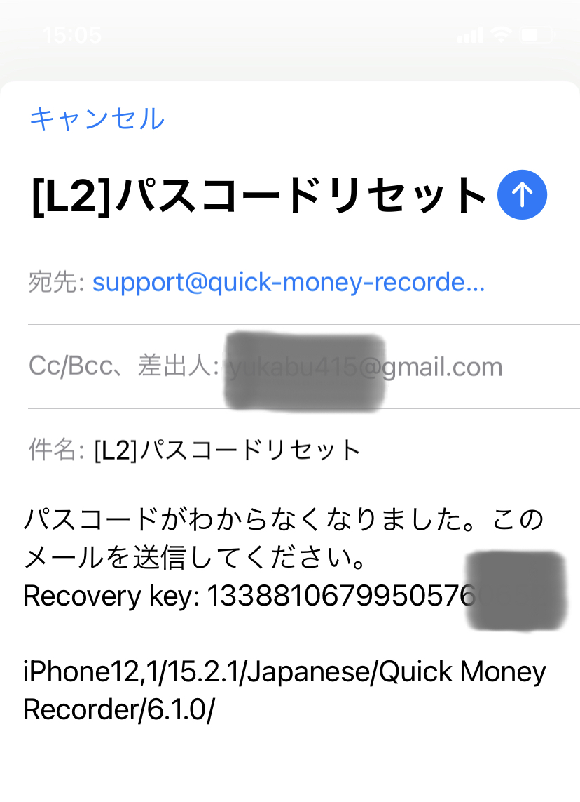 2.メールアプリが起動し、パスコードリセットメールが表示されますのでそのまま送信してください。