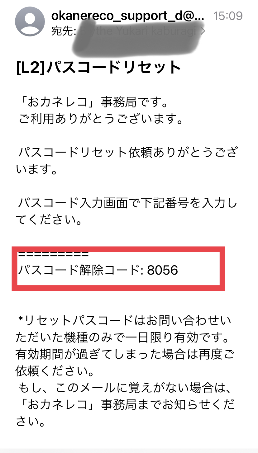 4.リセットメール内にパスコード解除コードが記載されています。記載されているコードをパスコード画面で入力します。