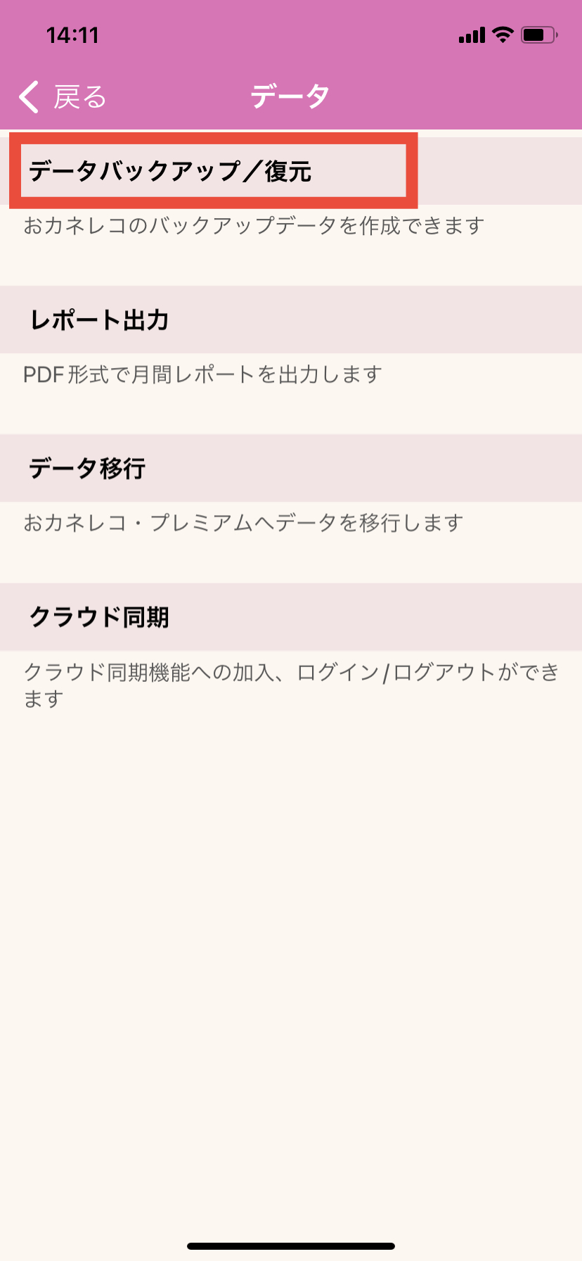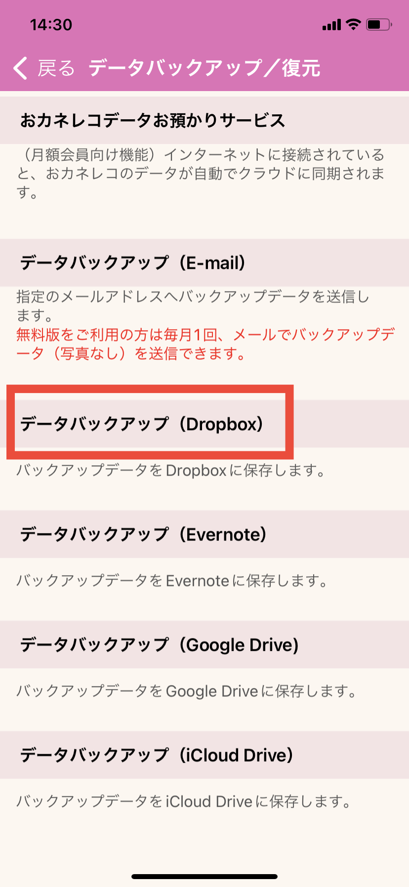 有料版おカネレコでは、E-mail以外にDropbox、Evernote、GoogleDrive、iCloudDriveへバックアップデータを保存することができます。保存したバックアップデータは同じOSのおカネレコでのみ復元が可能です。