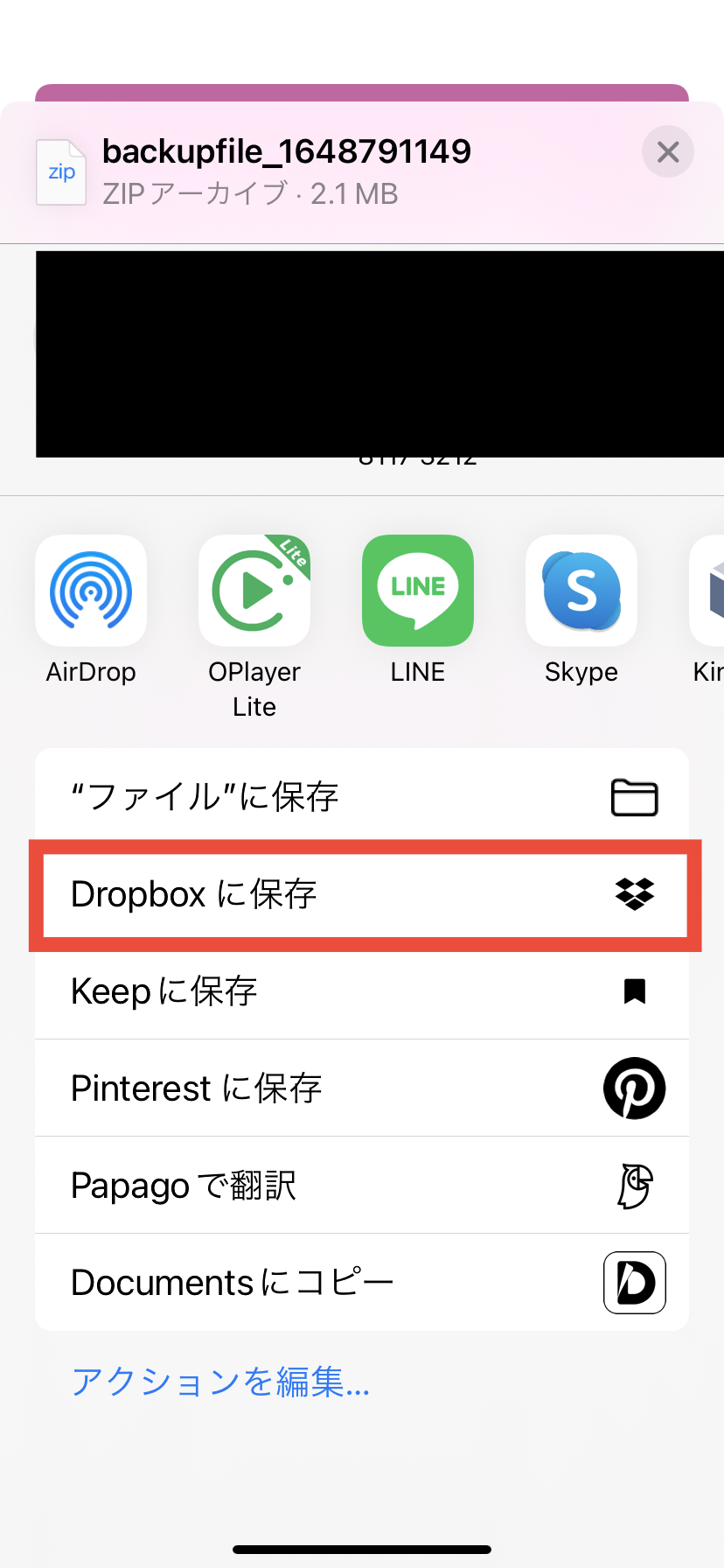 8. 共有画面で「Dropboxに保存」のアイコンを押します。