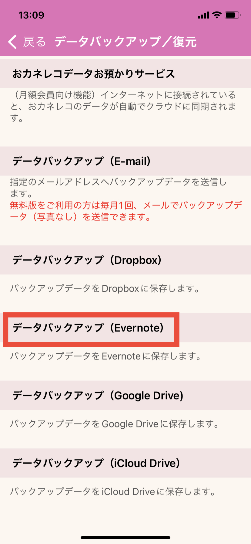 有料版おカネレコでは、E-mail以外にDropbox、Evernote、GoogleDrive、iCloudDriveへバックアップデータを保存することができます。保存したバックアップデータは同じOSのおカネレコでのみ復元が可能です。
