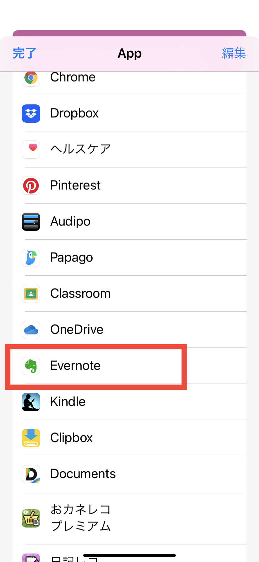 8. 共有画面で「Evernote」のアイコンを押してください。