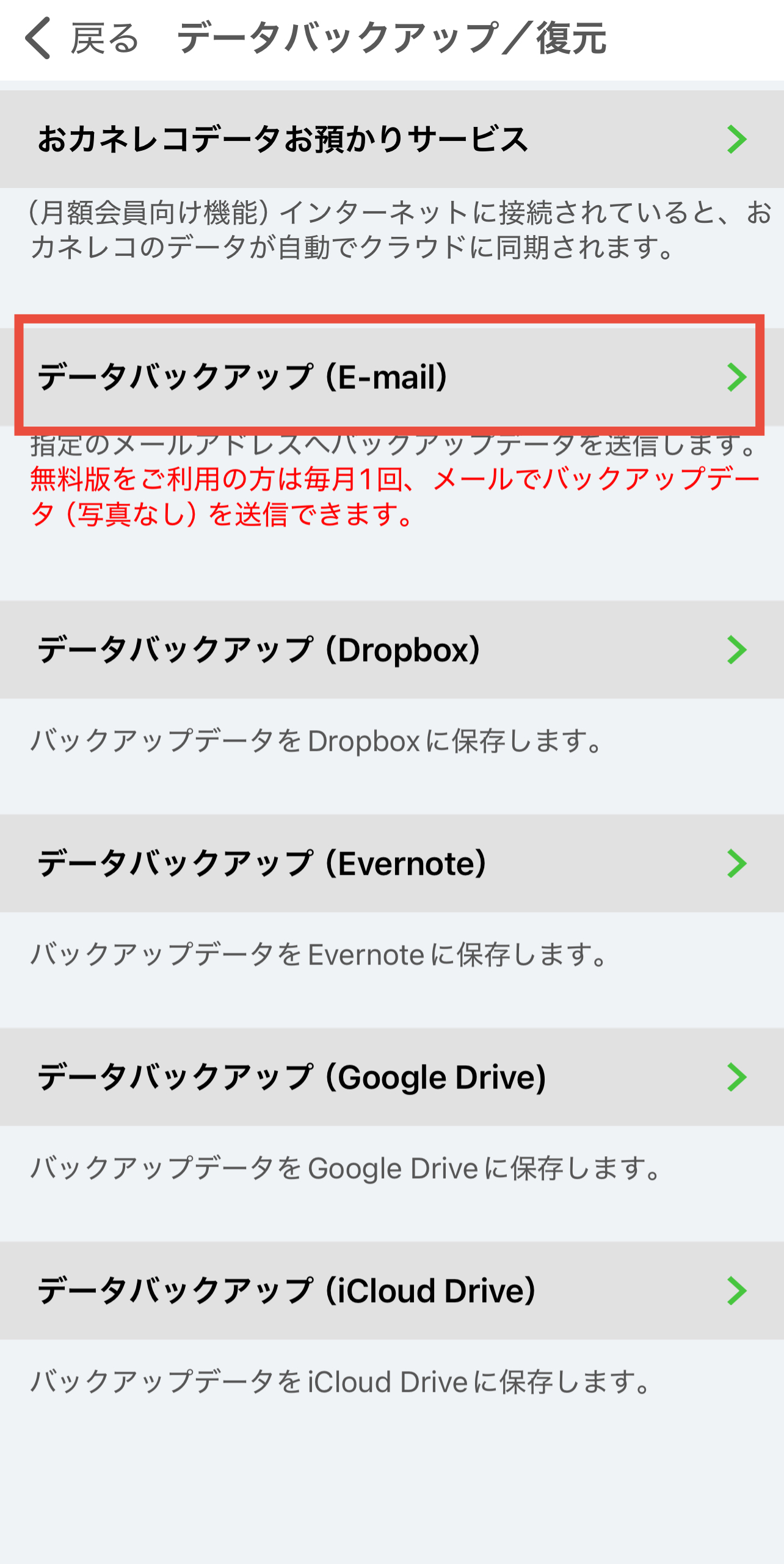 無料版では月に1回E-mailでバックアップデータを送信することができます。