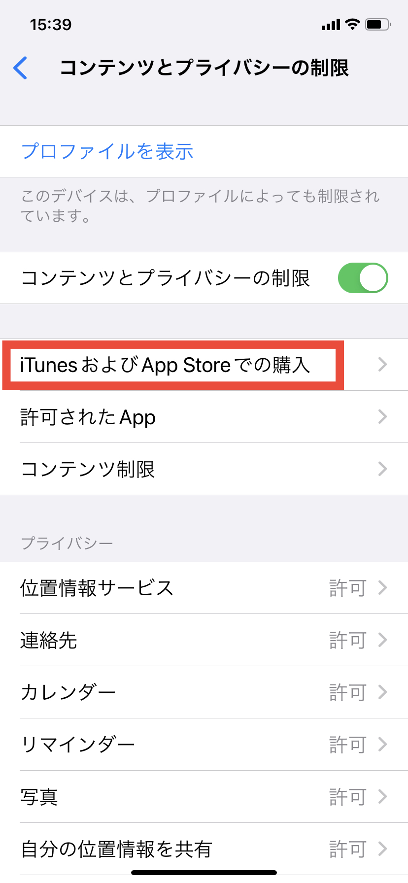 4. 「iTunesおよびAppStoreでの購入」を押し、「App内課金」が「許可」となっているかをご確認ください。
