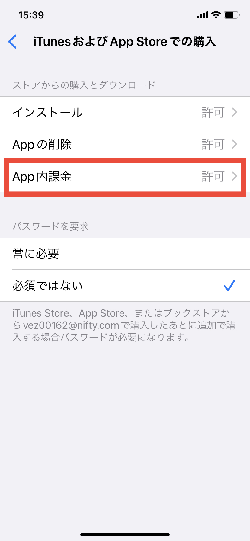 6. 「App内課金」がオフになっている場合は「オン」(緑色)にご変更ください。