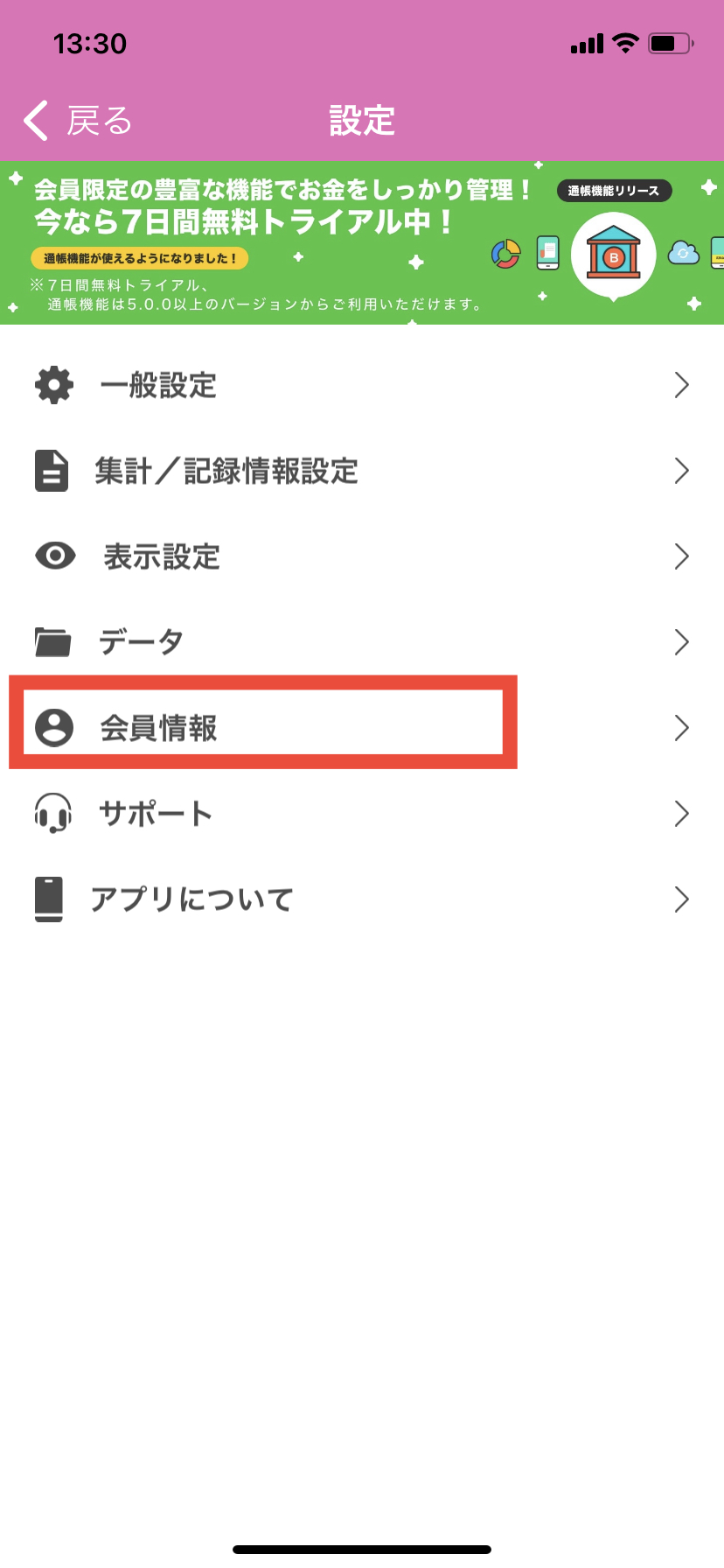 ご購入時にご利用いただいていたAppleID、Googleアカウントでログインし、おカネレコをインストールしていただいた後に下記の手順で有料追加機能復元(リストア)の操作を行っていただけますようお願いいたします。